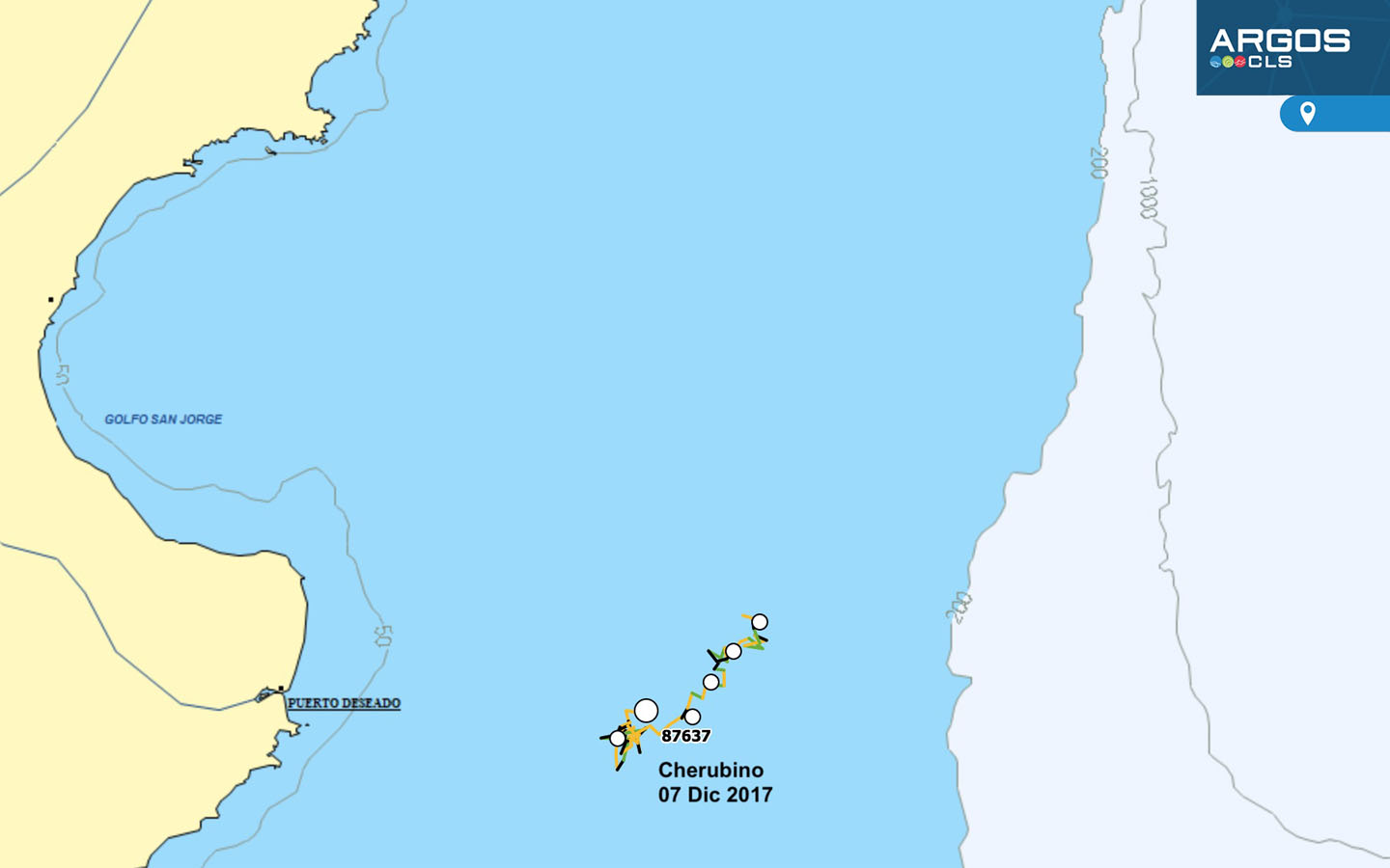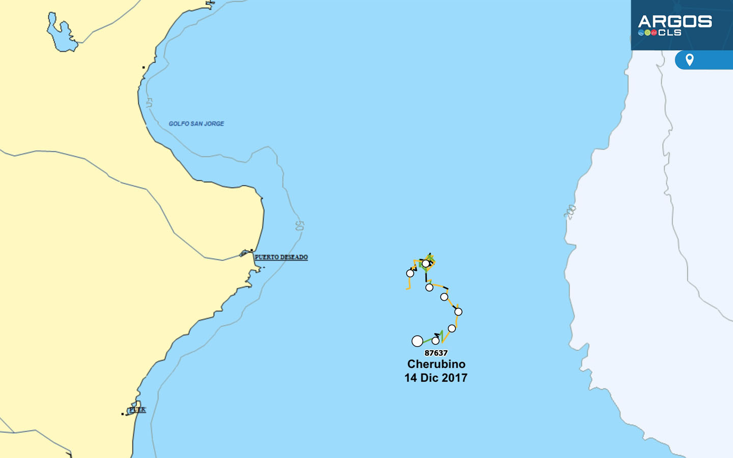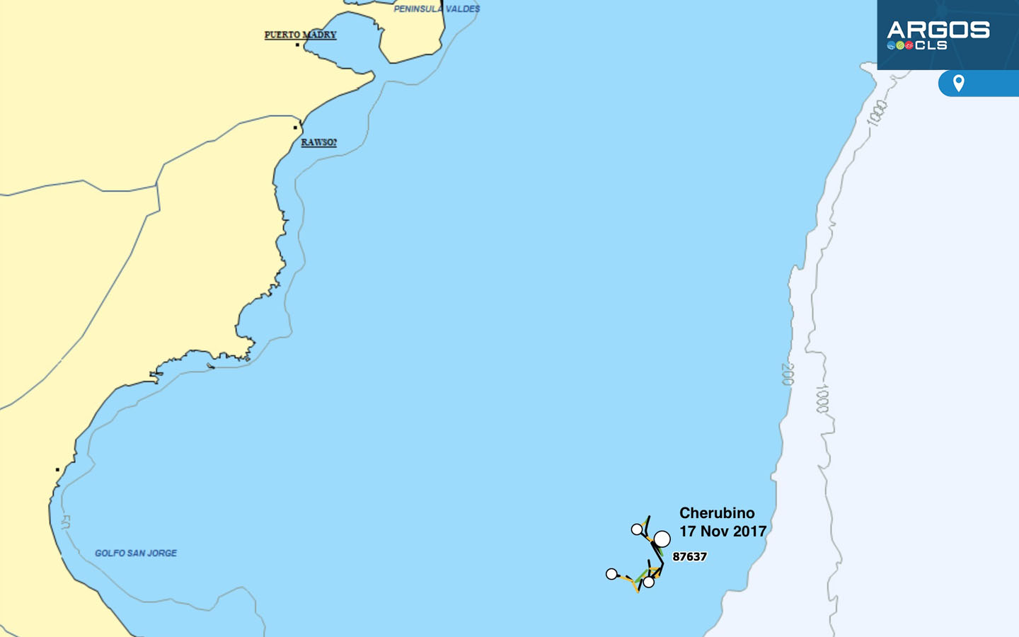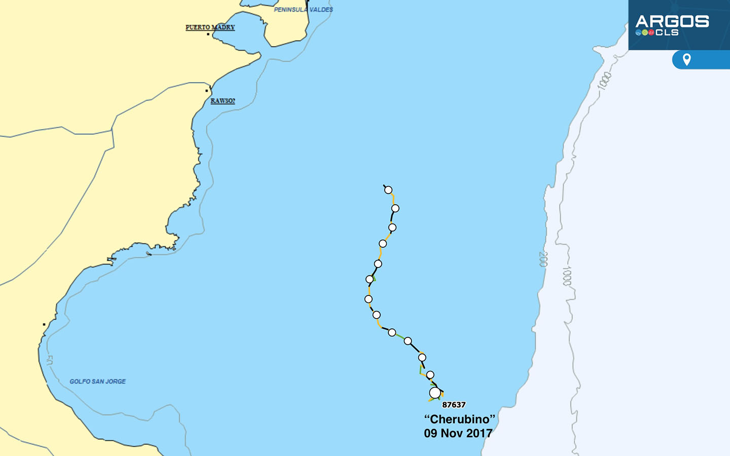Durante los últimos siete días, Cherubino continuó desplazándose en dirección Sur. A 10 días de salir por la boca del Golfo Nuevo se encuentra ahora a 400 kilómetros de distancia y acercándose a la zona del talud frente al Golf San Jorge.