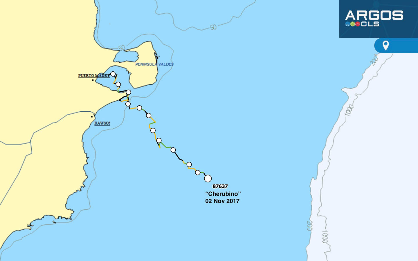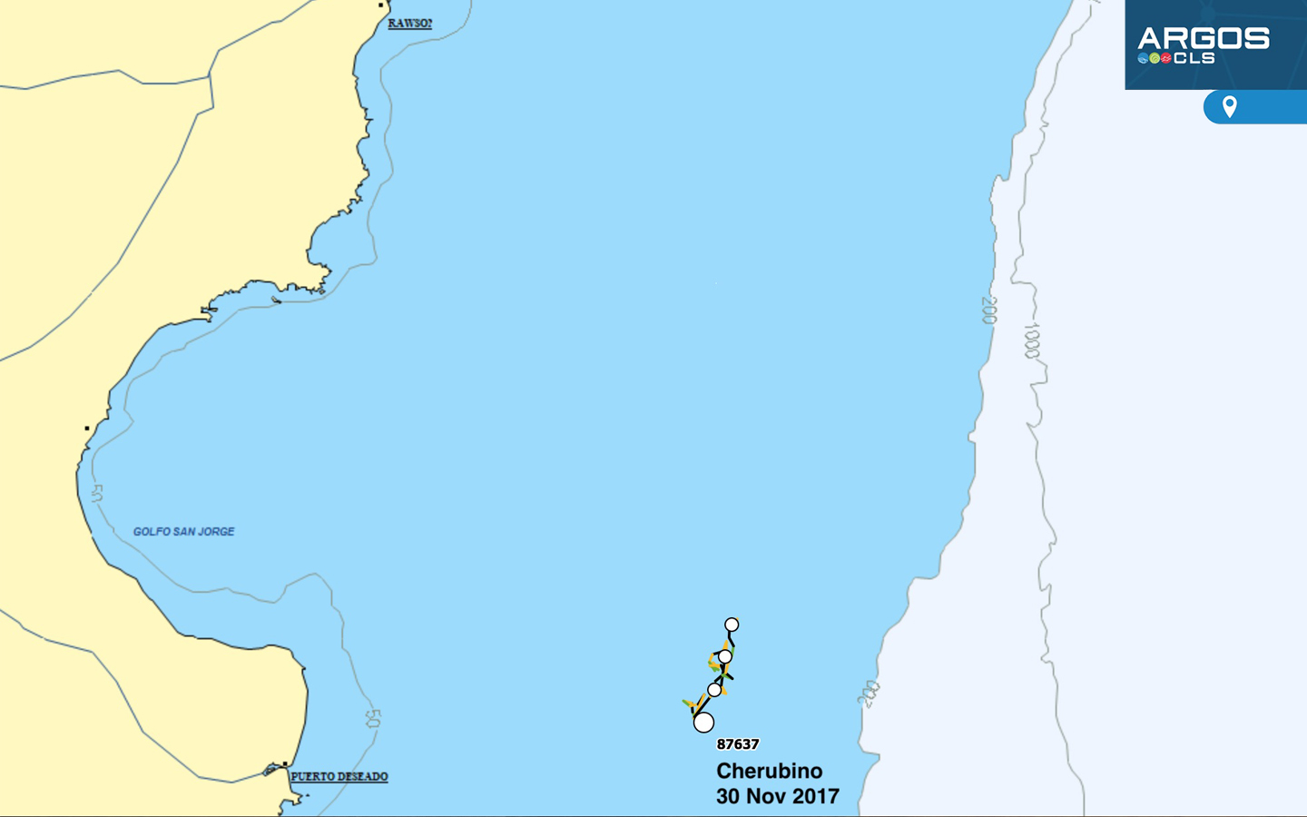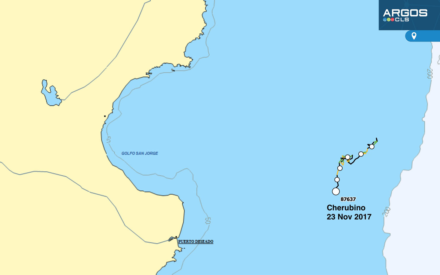 Durante los últimos siete días, Cherubino continuó desplazándose en dirección Sur. A 10 días de salir por la boca del Golfo Nuevo se encuentra ahora a 400 kilómetros de distancia y acercándose a la zona del talud frente al Golf San Jorge.