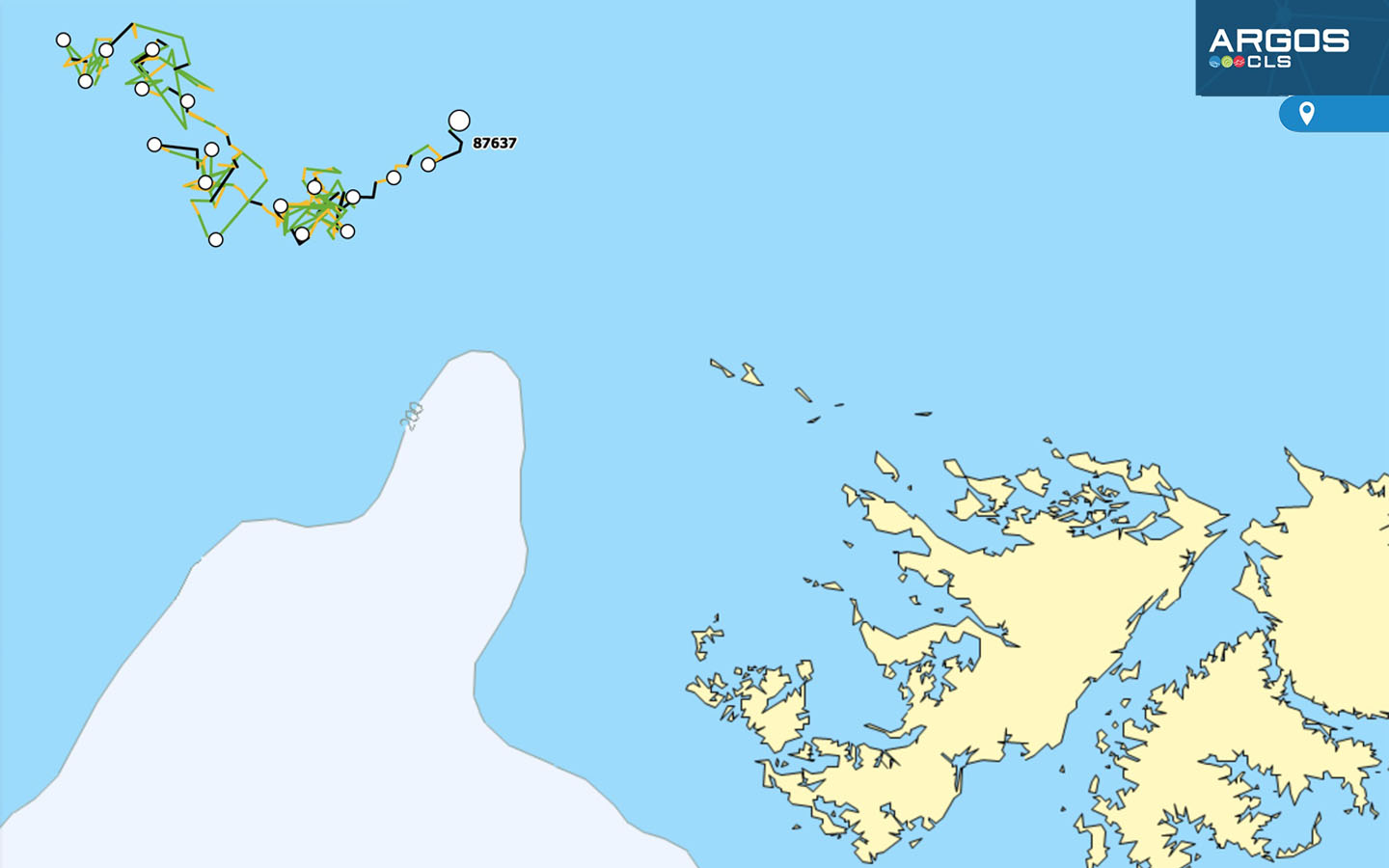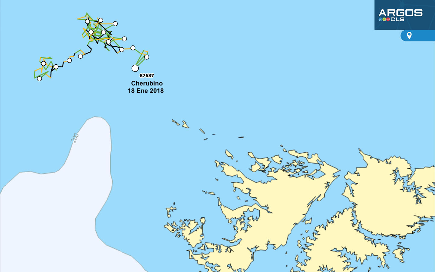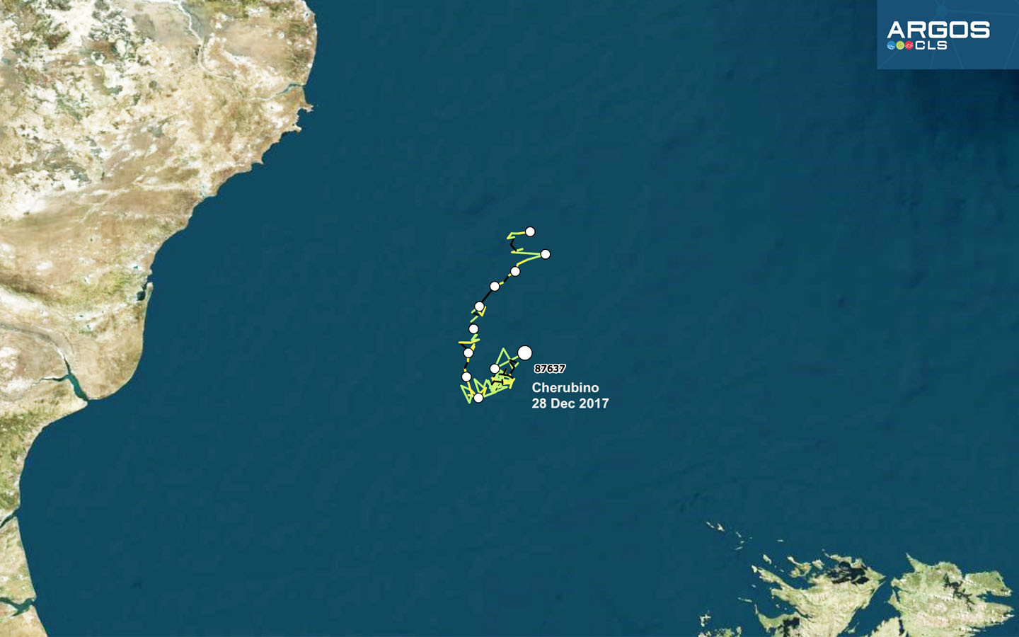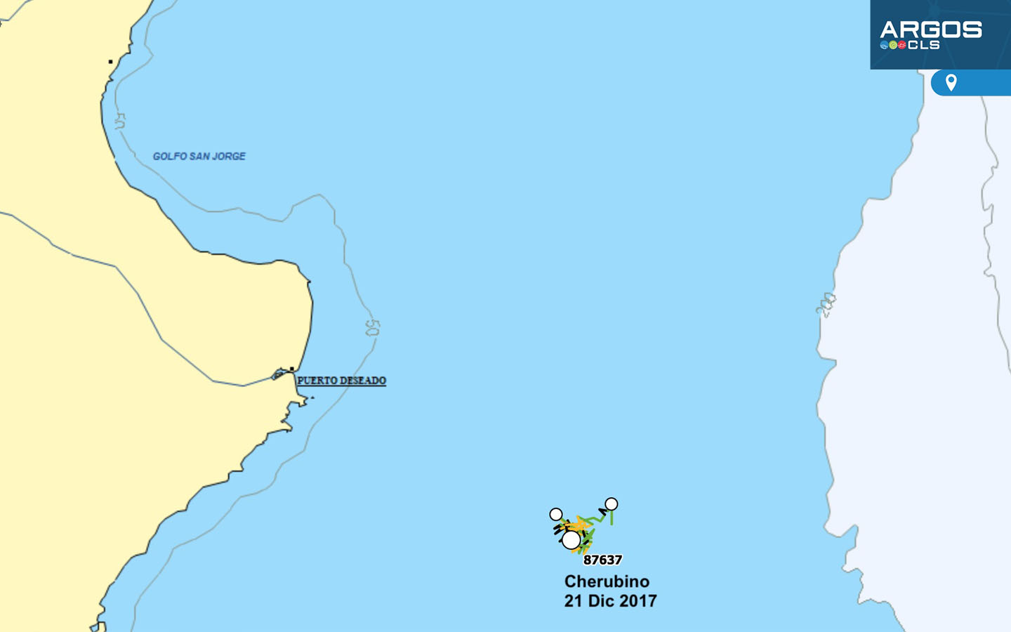 Durante los últimos siete días, Cherubino continuó desplazándose en dirección Sur. A 10 días de salir por la boca del Golfo Nuevo se encuentra ahora a 400 kilómetros de distancia y acercándose a la zona del talud frente al Golf San Jorge.