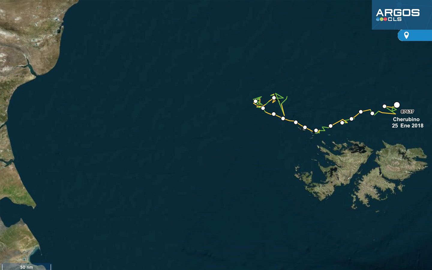 Cherubino se acerca lentamente a las Islas Malvinas y ahora se encuentra a 50 millas náuticas de las Islas Salvajes, dos islas ubicadas en el extremo noroeste del archipiélago.