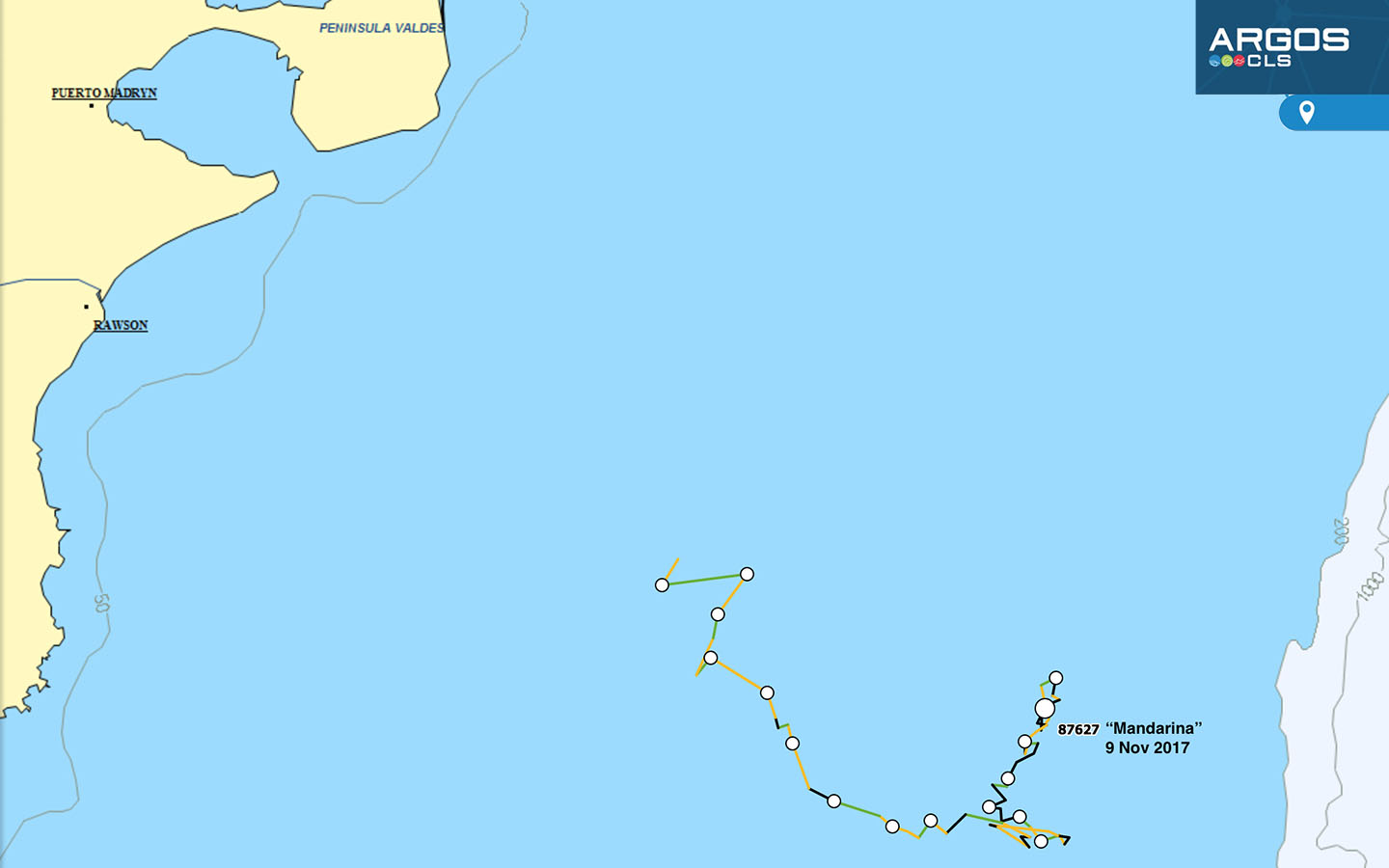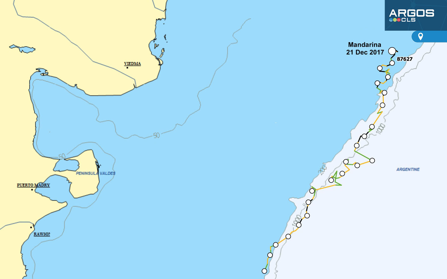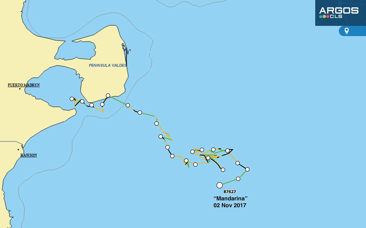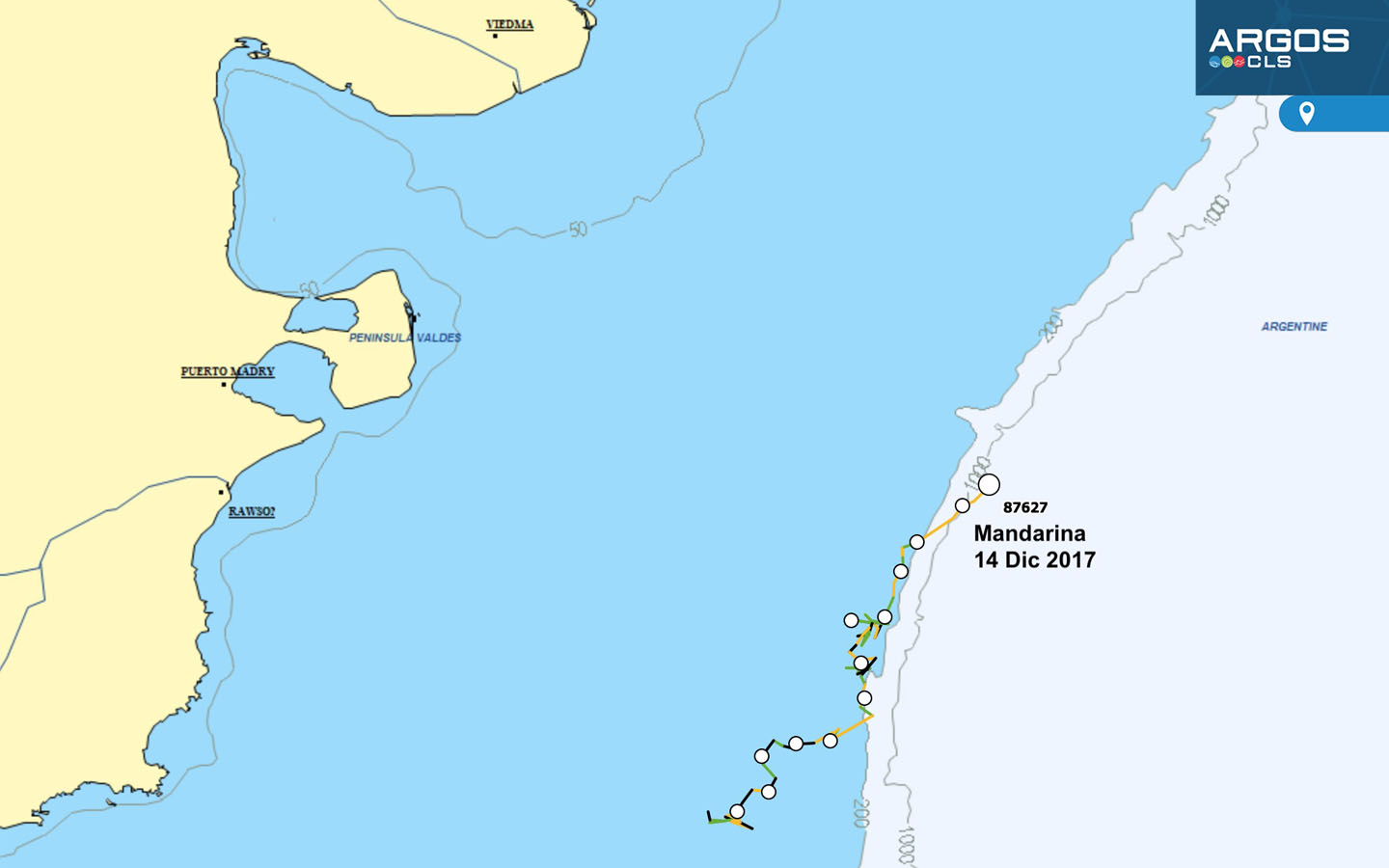 Mandarina continuó viaje hasta unos 250 km al sureste de Península Valdés y luego tomó rumbo norte y comenzó a desplazarse mucho más lentamente en esa dirección, con comportamiento de búsqueda.