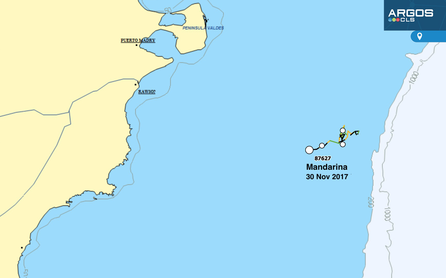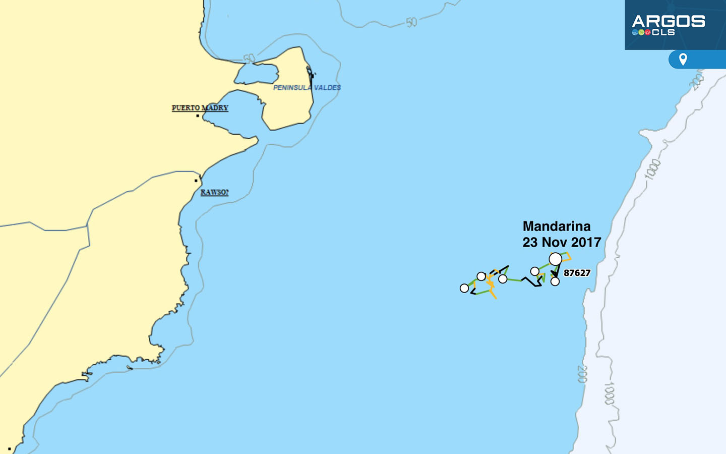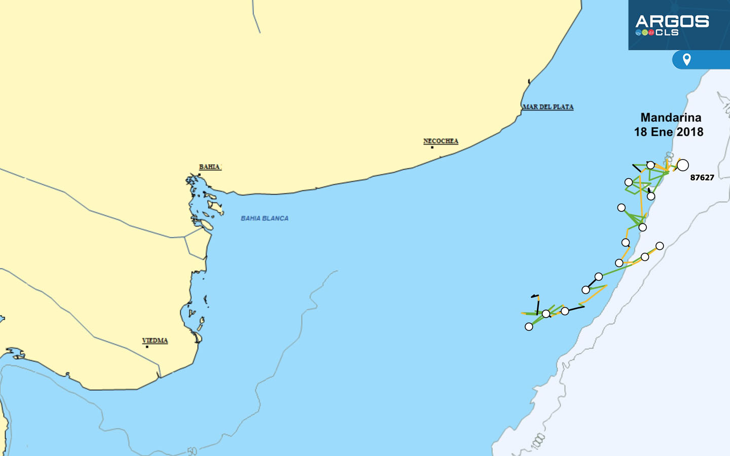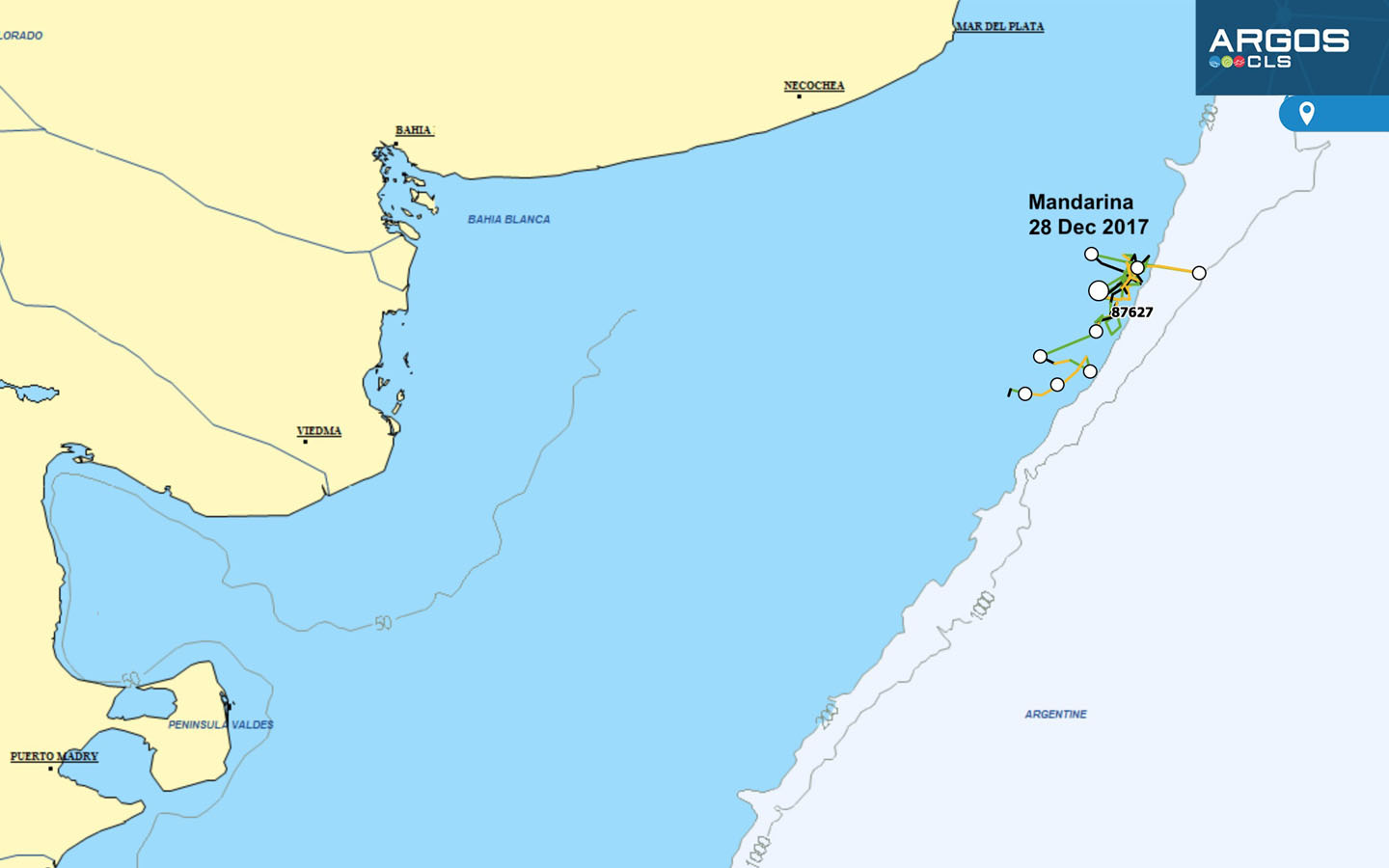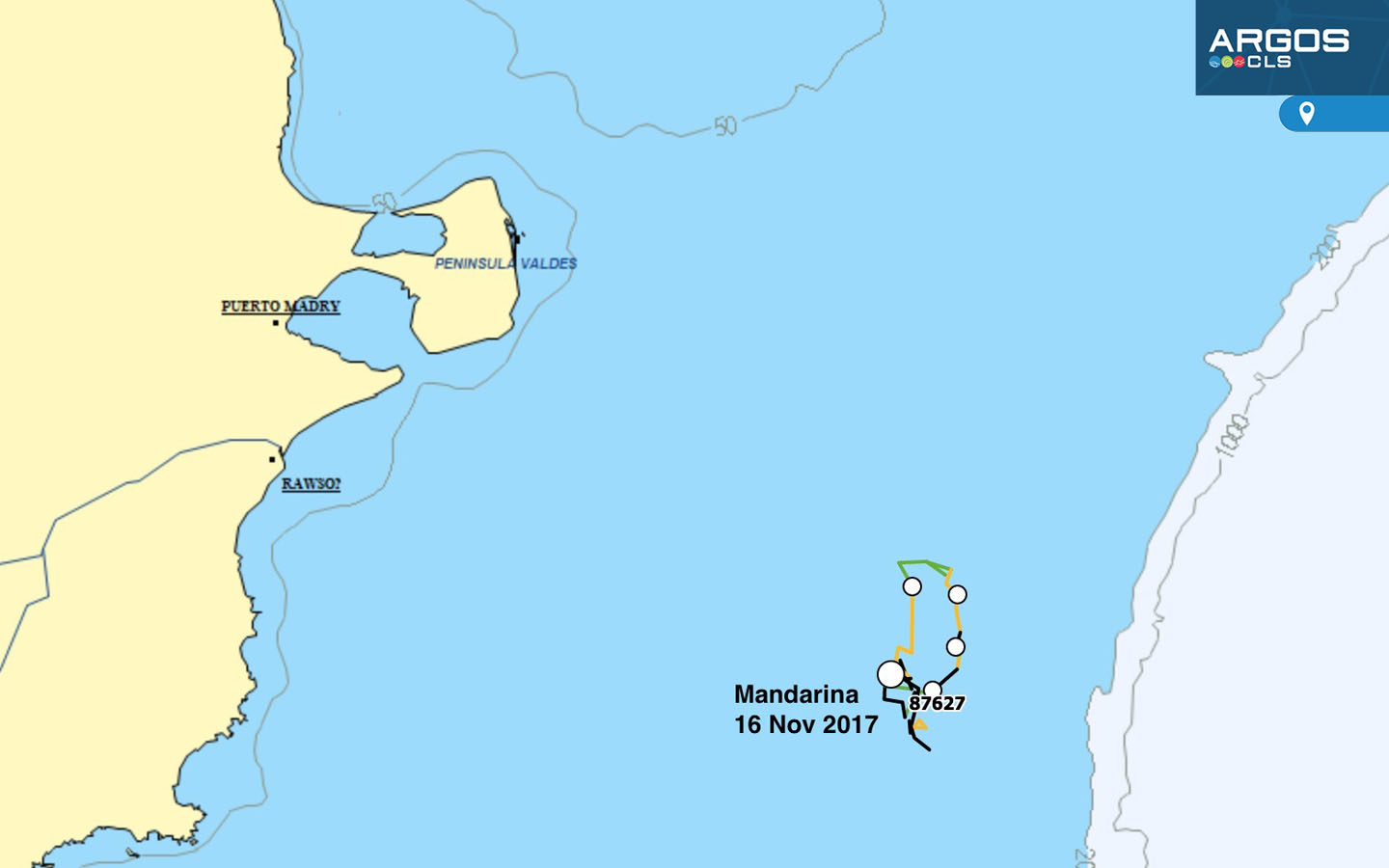 Mandarina se encuentra ahora en la zona del talud, a la latitud de Bahía Blanca, en donde detuvo su traslado hacia el norte. Al parecer, comienza a realizar comportamientos de búsqueda.