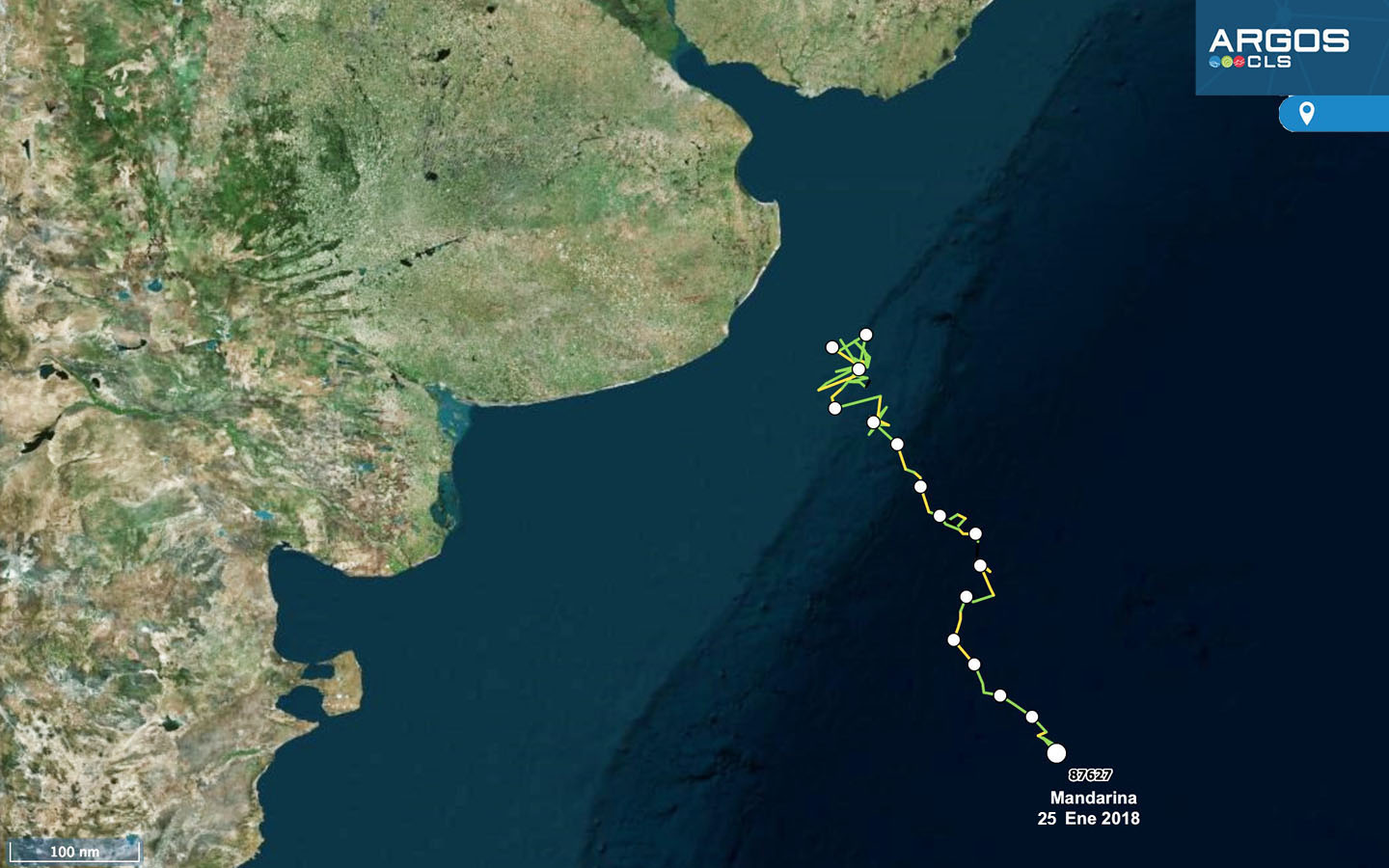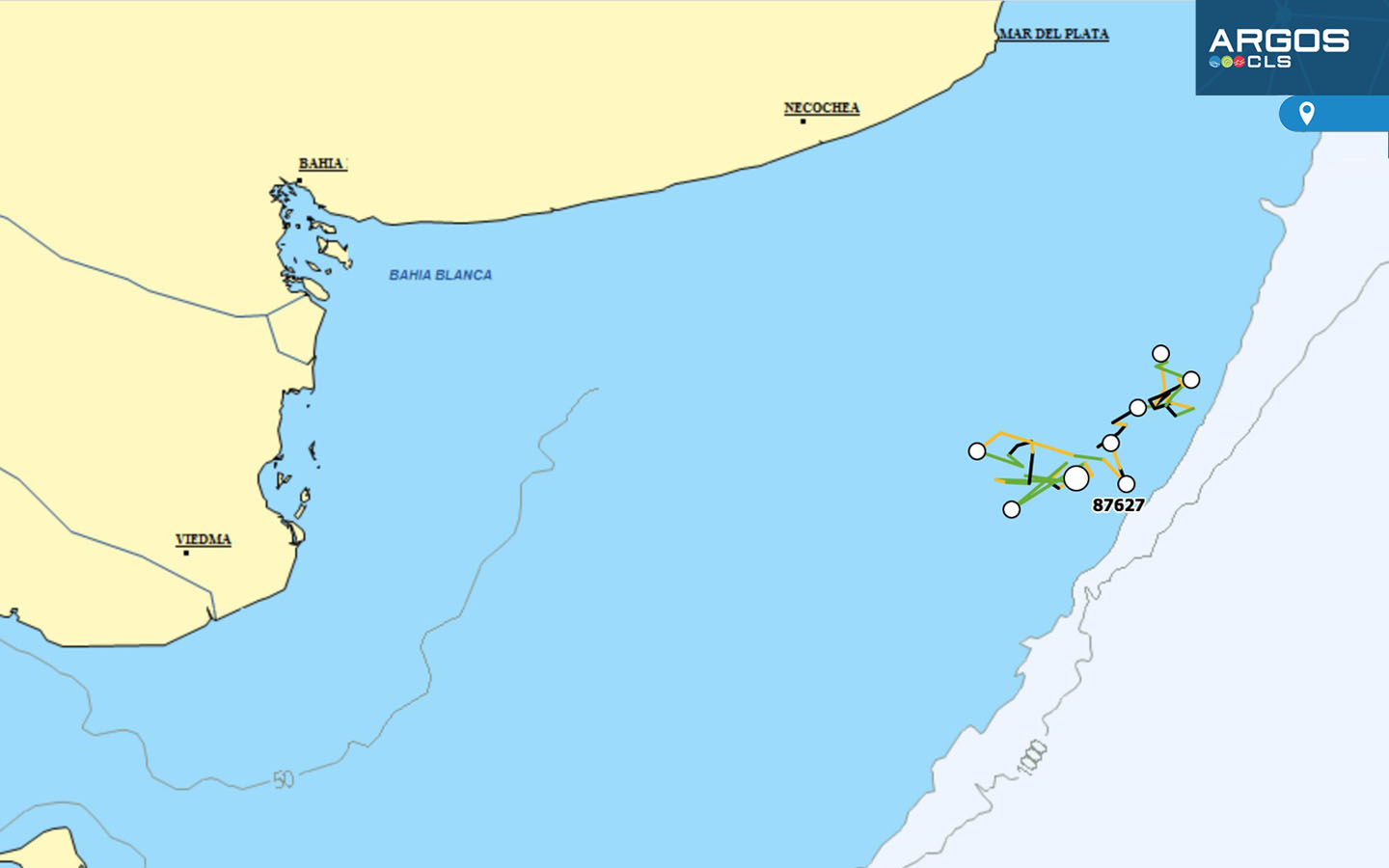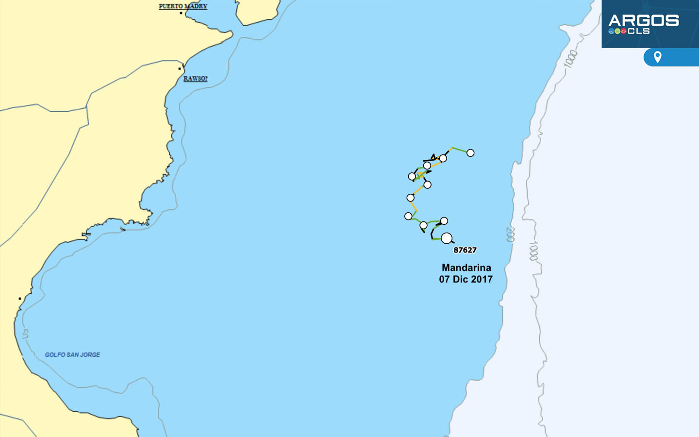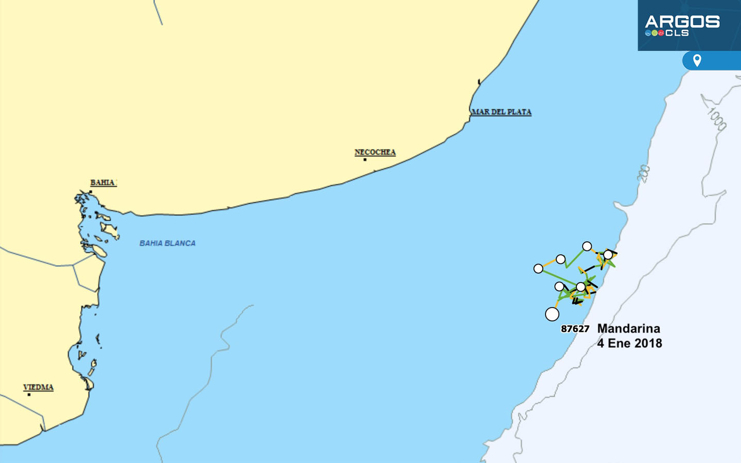 Mandarina se encuentra ahora en la zona del talud, a la latitud de Bahía Blanca, en donde detuvo su traslado hacia el norte. Al parecer, comienza a realizar comportamientos de búsqueda.
