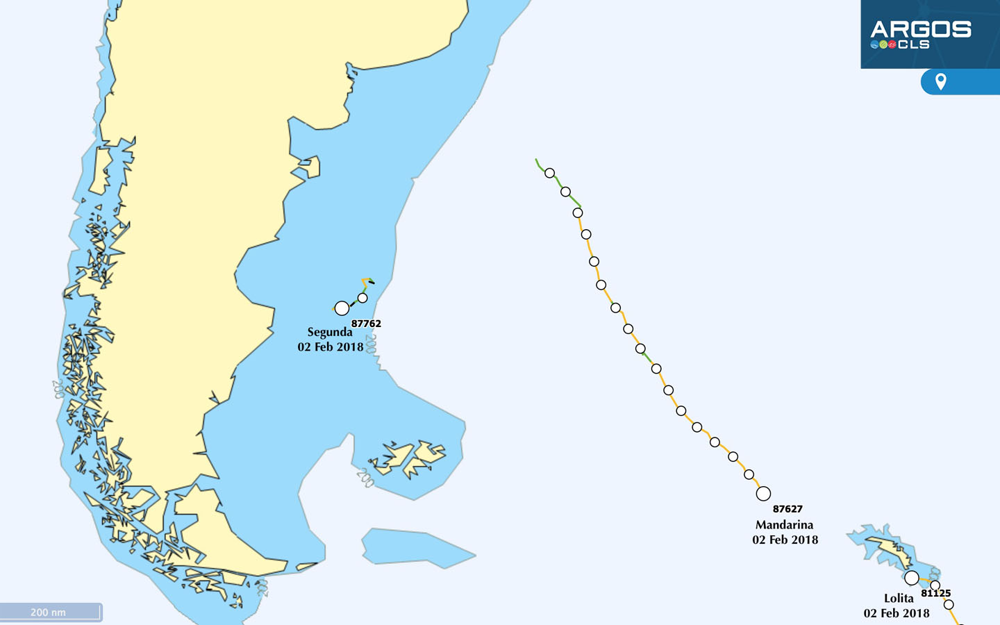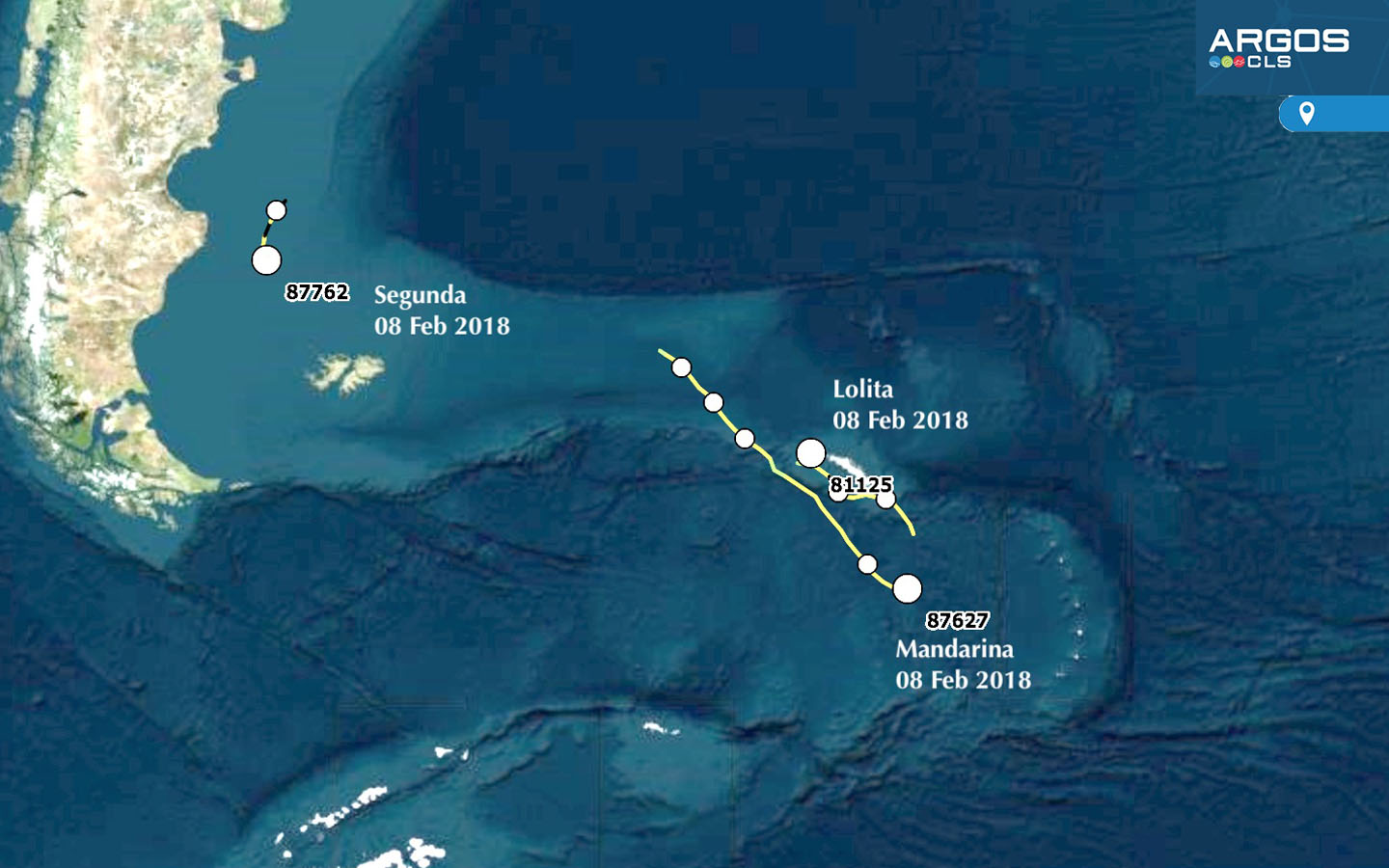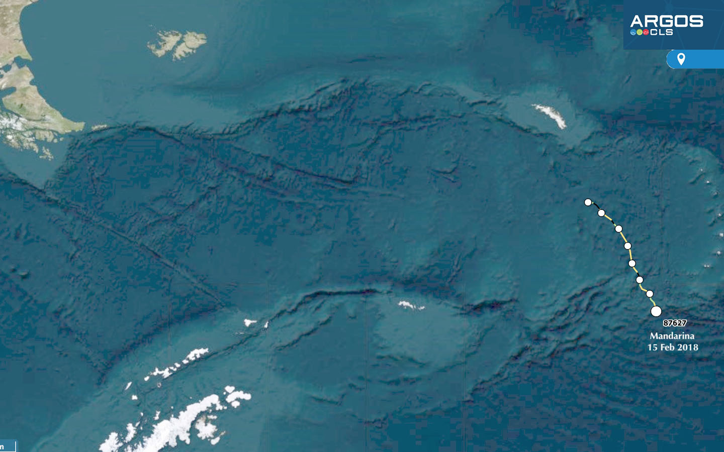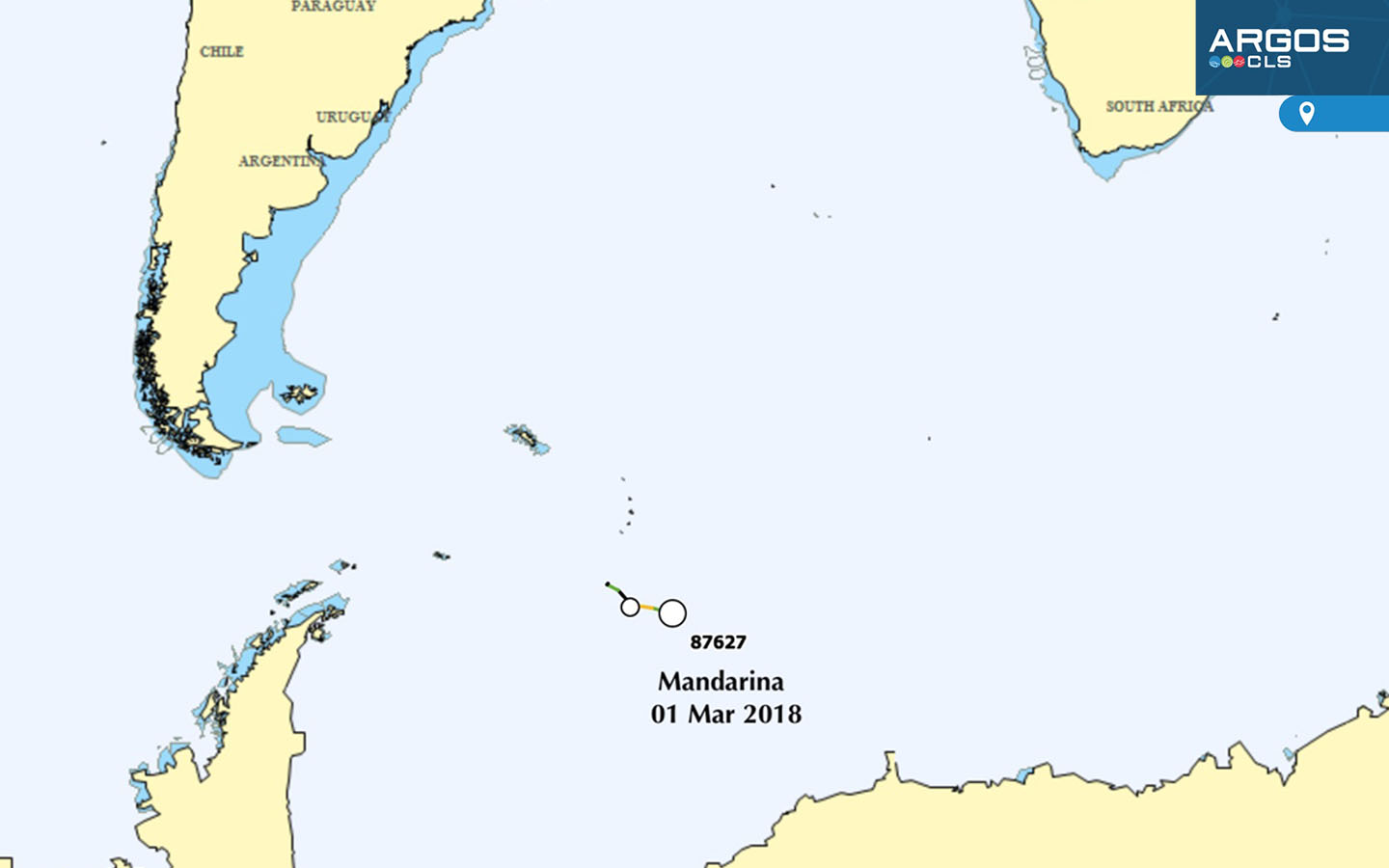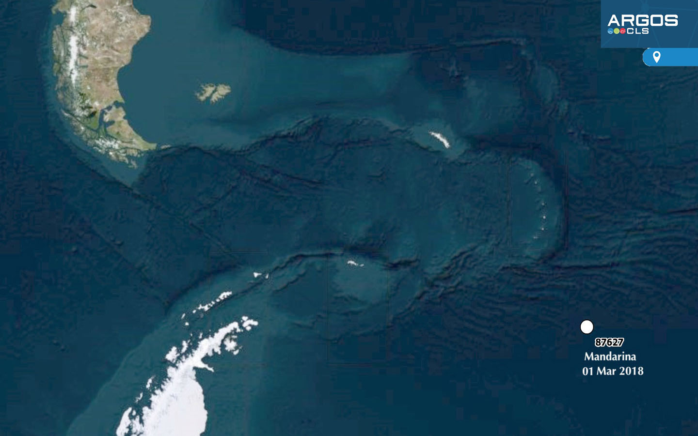 Mandarina se encuentra ahora en la zona del talud, a la latitud de Bahía Blanca, en donde detuvo su traslado hacia el norte. Al parecer, comienza a realizar comportamientos de búsqueda.