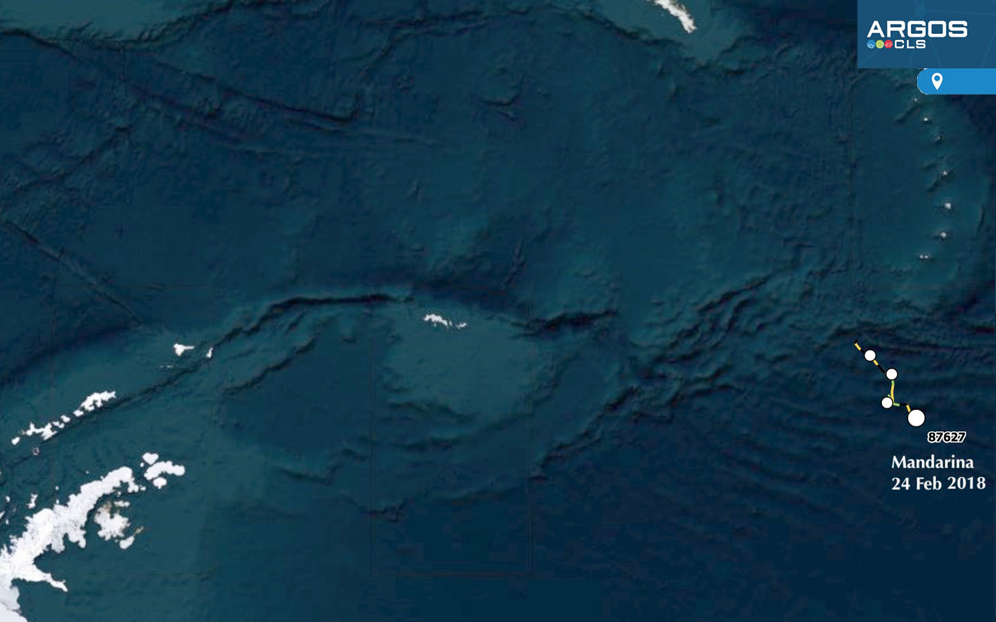 Mandarina dejó atrás la plataforma continental durante la última semana y se dirigió rápidamente hacia el sudeste. En 5 días cubrió casi 300 millas náuticas nadando a un promedio de casi 5 kilómetros en la hora. En estos momentos se encuentra en aguas de casi 6 kilómetros de profundidad. ¿Estará también dirigiéndose a las Islas Georgias en el Atlántico Sur?