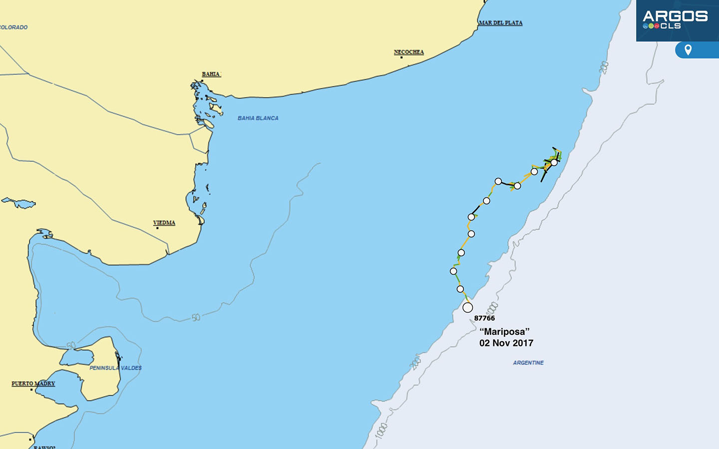 El dispositivo que llevaba Mariposa dejó de transmitir esta semana, cuando se encontraba sobre la plataforma a la altura de Puerto Deseado