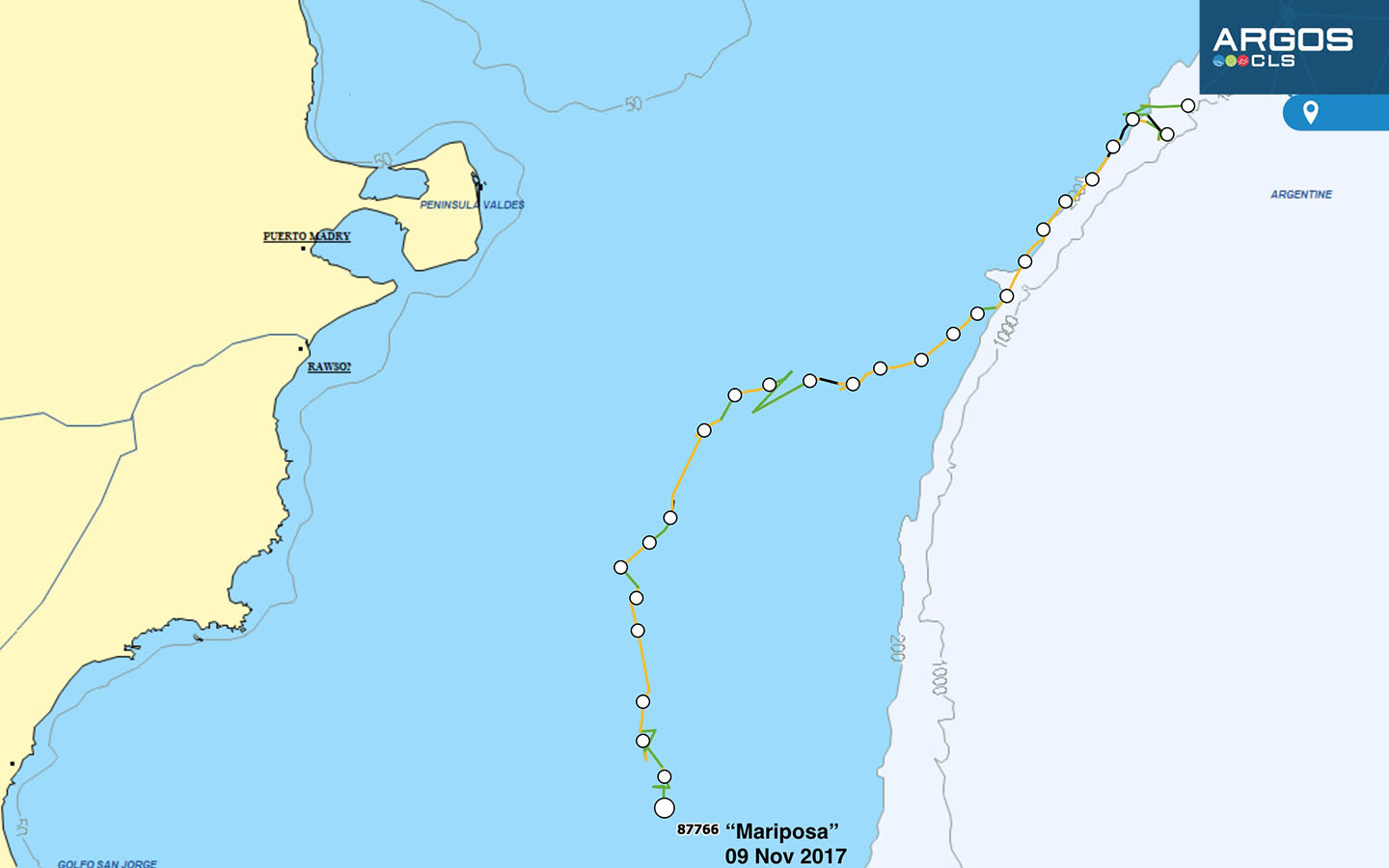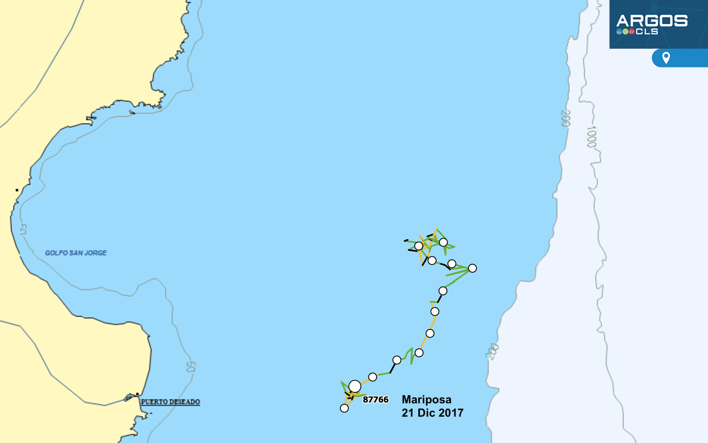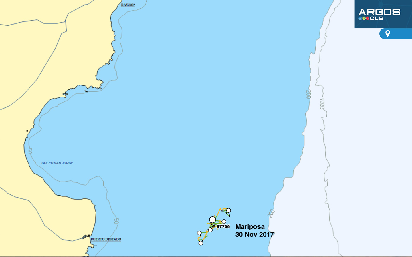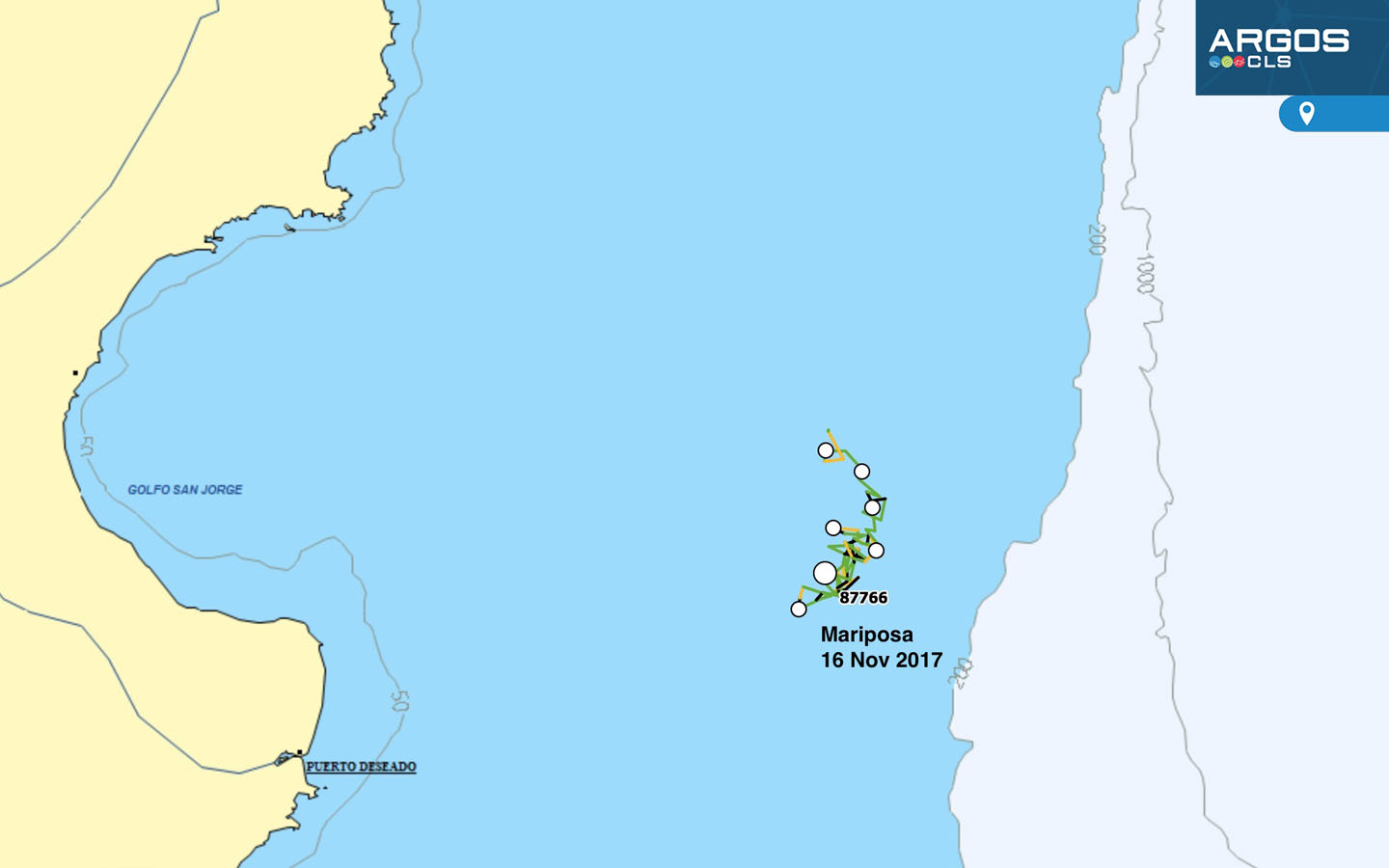 Mariposa se dirigió lentamente hacia el norte, manteniéndose sobre la plataforma continental, y ahora se encuentra muy cerca de Segunda, frente al Golfo San Jorge.