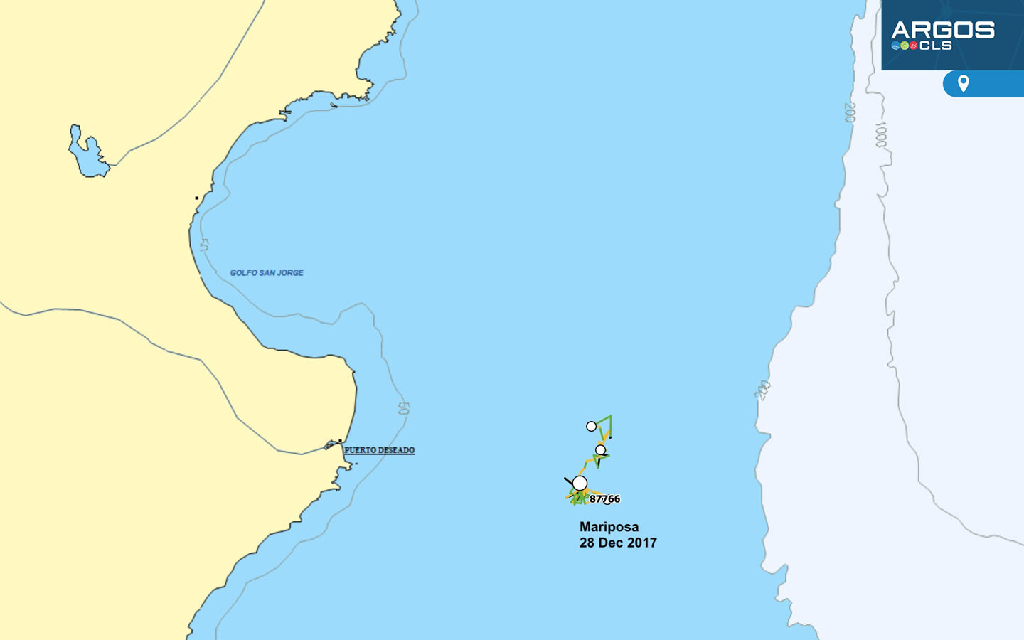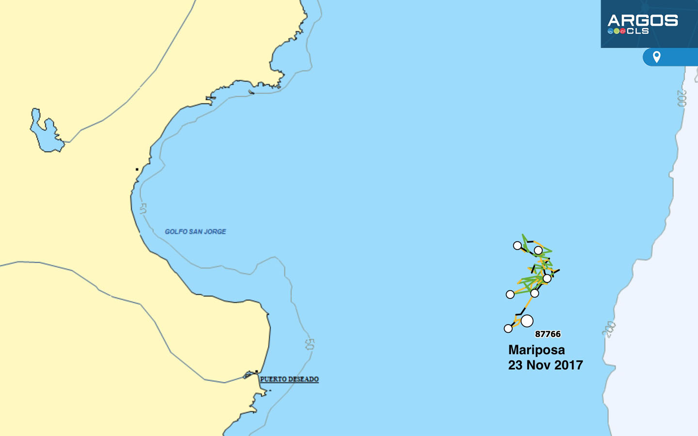 Mariposa se desplaza lentamente a 200 km al este de Cabo Blanco en la provincia de Santa Cruz, en lo que parece ser comportamiento de búsqueda.