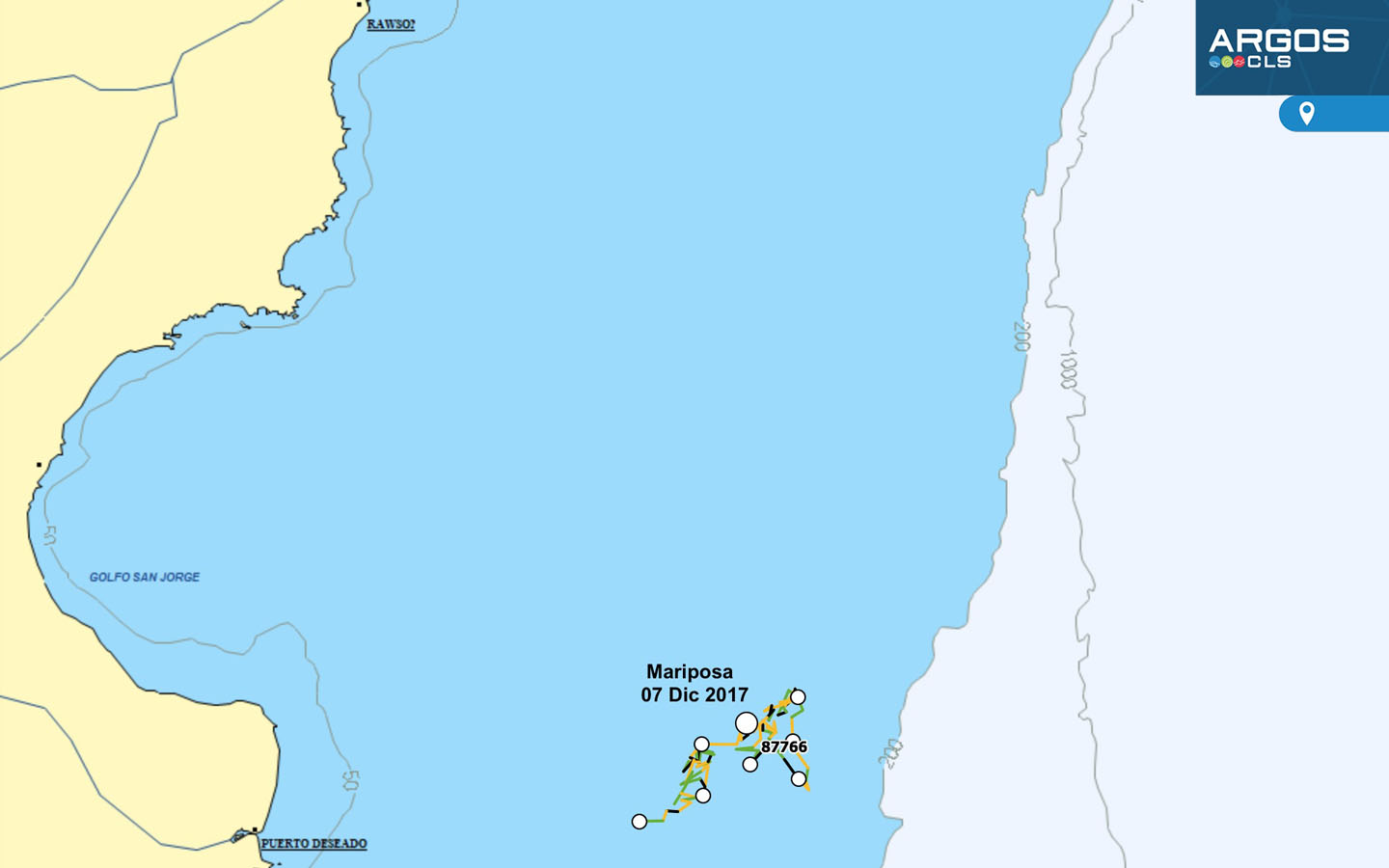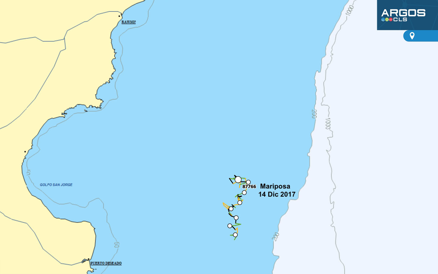 Mariposa se encuentra en las últimas 3 semana, en inmediaciones del borde del talud en la latitud de Bahía San Blas, por donde se mueve lentamente.