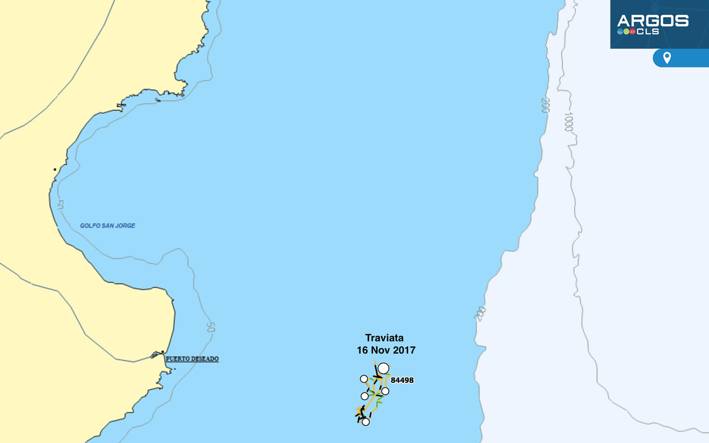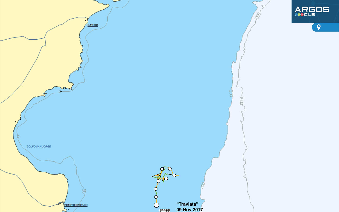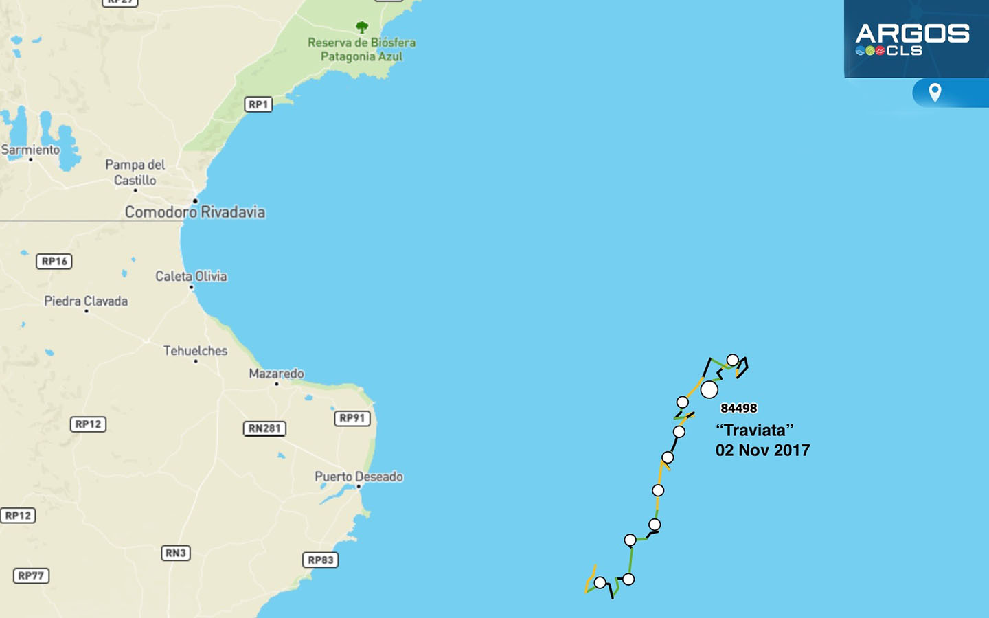 El dispositivo de Traviata dejó de transmitir el fin de semana pasado cuando se encontraba frente al Golfo San Jorge muy cerca de Segunda.