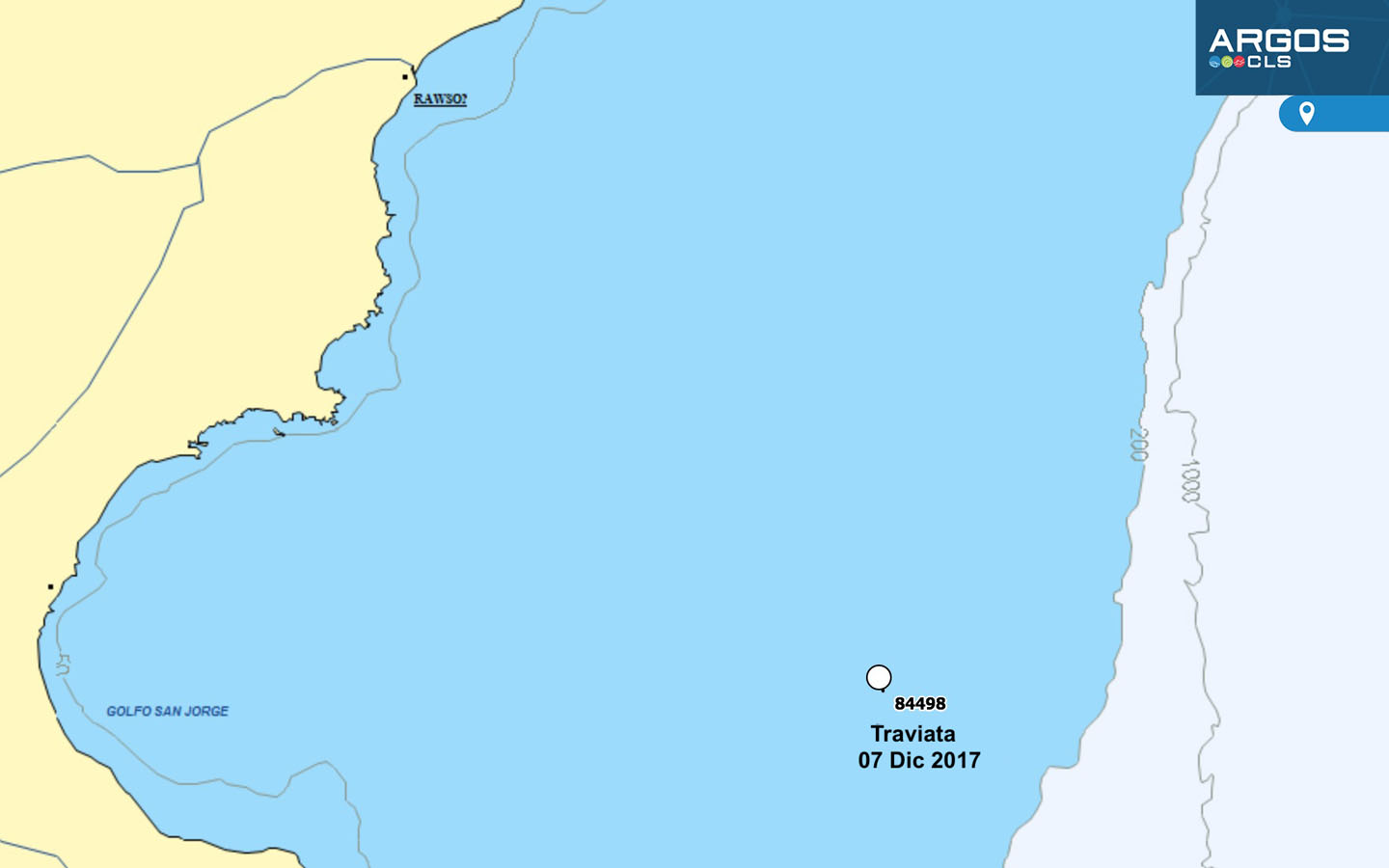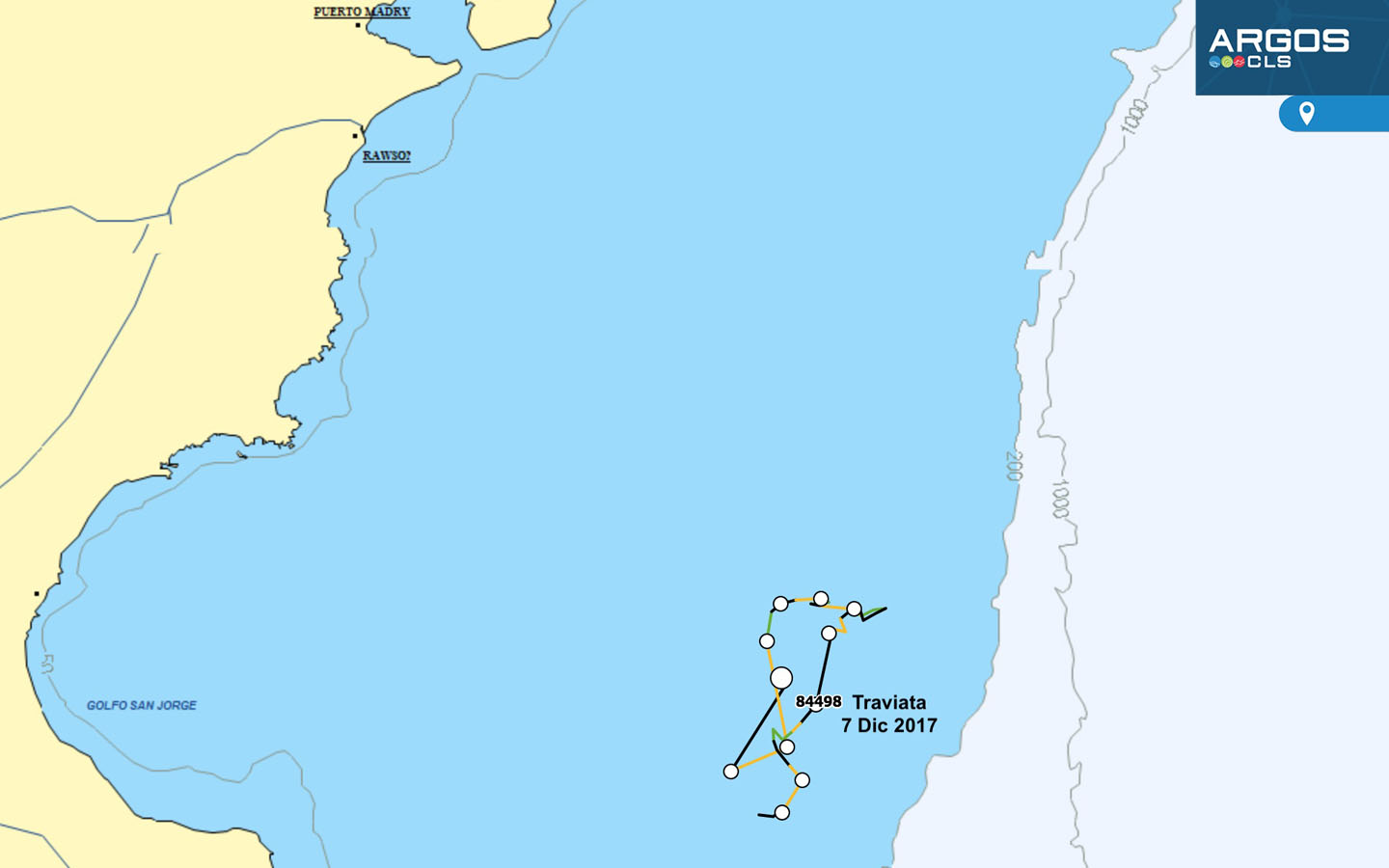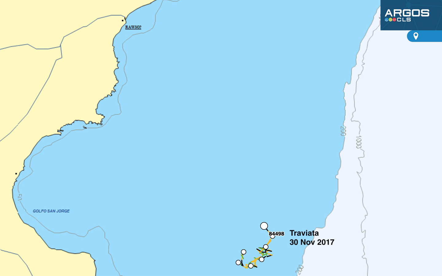 El dispositivo de Traviata dejó de transmitir el fin de semana pasado cuando se encontraba frente al Golfo San Jorge muy cerca de Segunda.