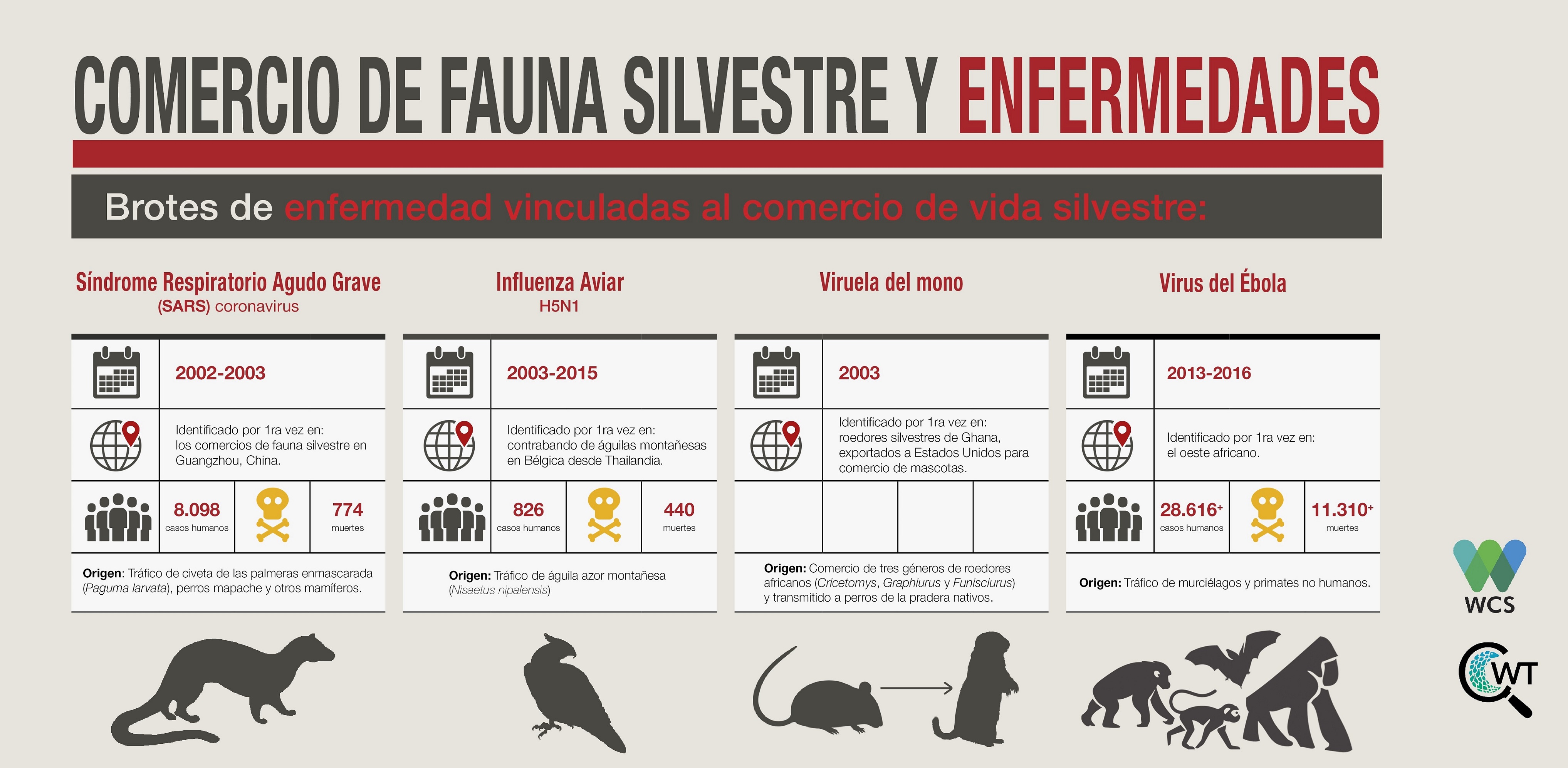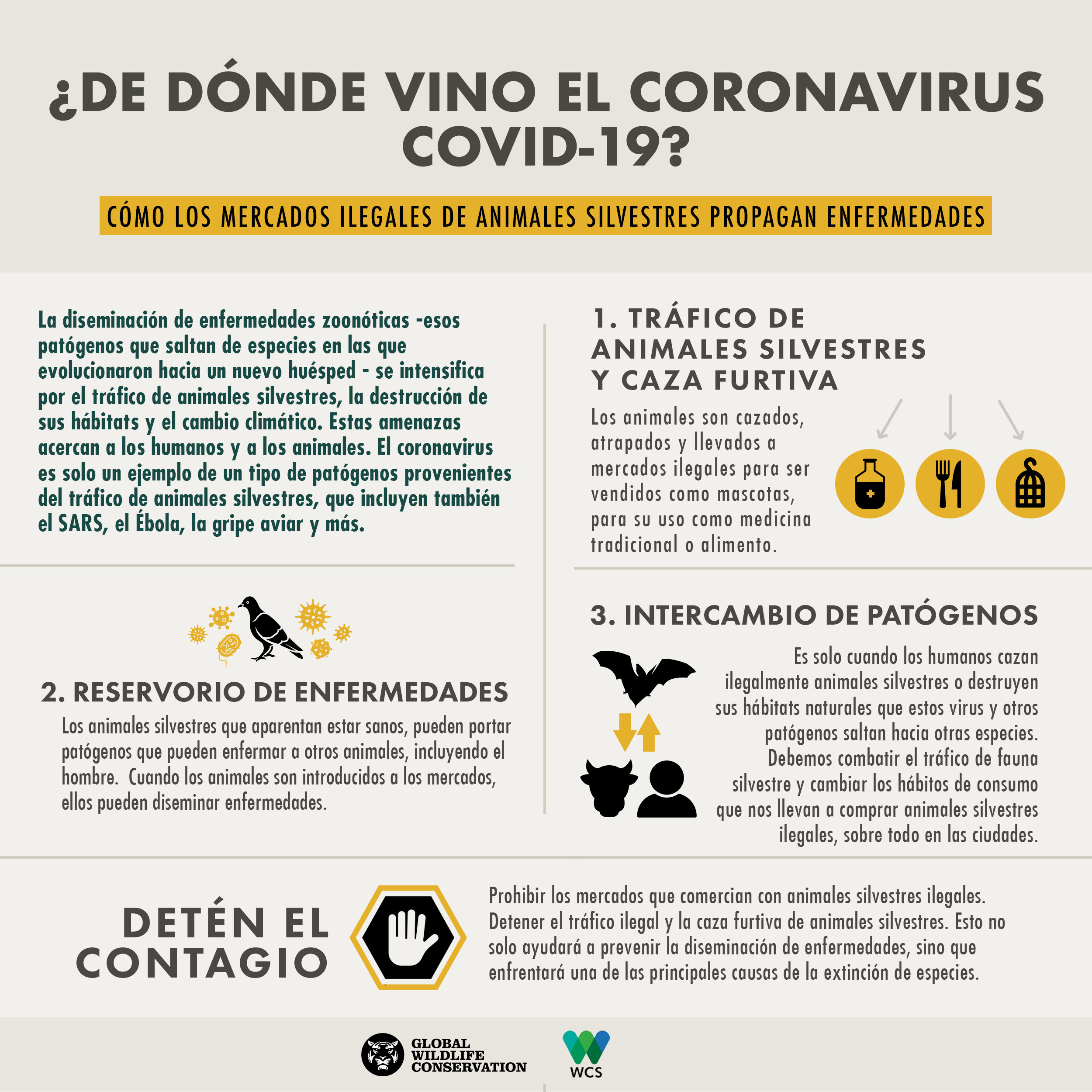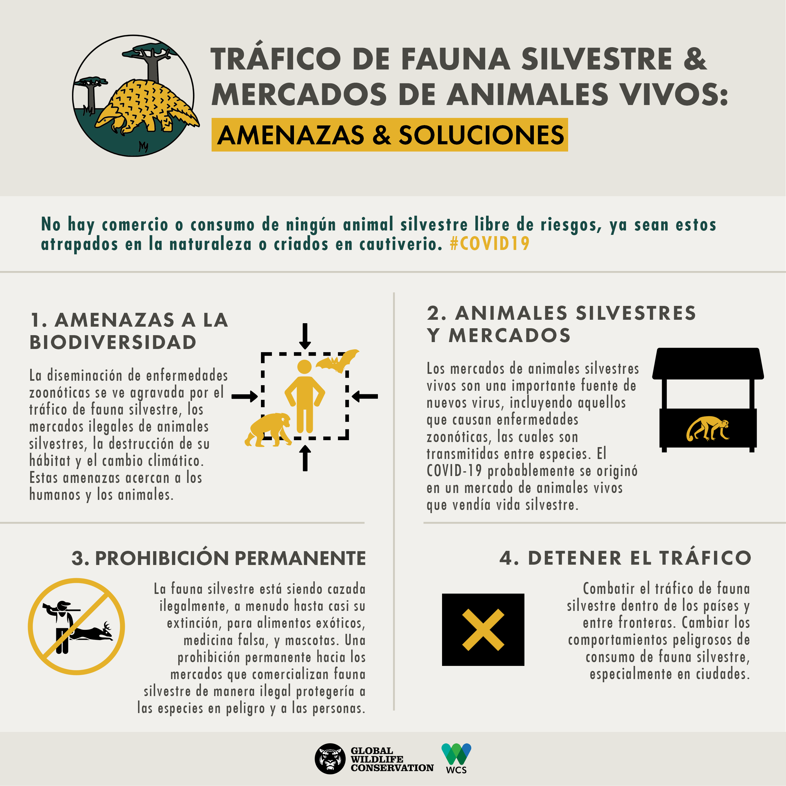La diseminación de enfermedades zoonóticas como el COVID_19 se intensifica por el tráfico de animales silvestres, la destrucción de sus hábitats y el cambio climático. Es por ello, que desde WCS reiteramos nuestro mensaje global: “debemos prohibir los mercados que comercializan animales silvestres y detener la caza ilegal y el tráfico de fauna silvestre. Esto no sólo ayudará a prevenir la diseminación de enfermedades, sino que enfrentará una de las principales causas de la extinción de especies”.