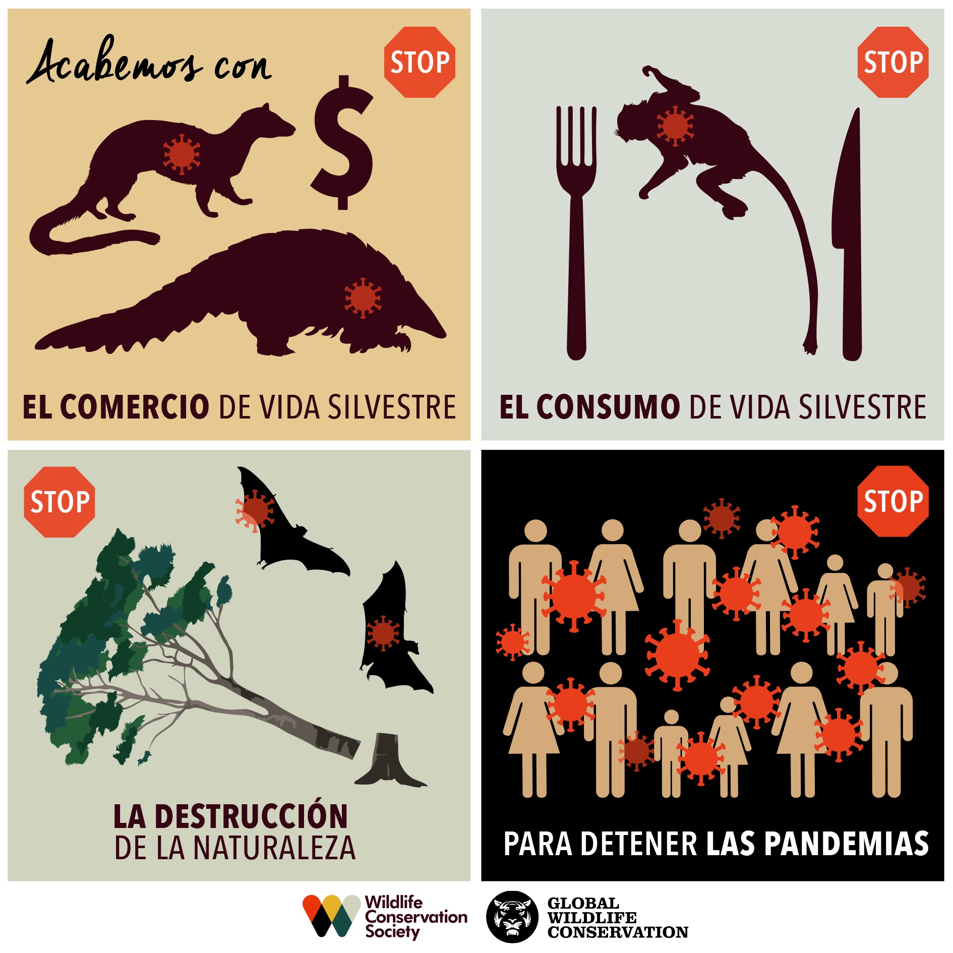 Con este propósito, Wildlife Conservation Society formó una coalición con Global Wildlife Conservation y WildAid para detener el comercio y venta en mercados de animales silvestres para consumo humano. Junto a profesionales de la salud, organizaciones conservacionistas y muchos otros, impulsan un movimiento global, #EndTheTrade (Frenar el tráfico, en español), dirigido a los gobiernos del mundo para detener todo el comercio de vida silvestre para consumo humano (particularmente, de aves y mamíferos) y cerrar todos estos mercados húmedo. La petición se puede firmar en http://endthetrade.com.