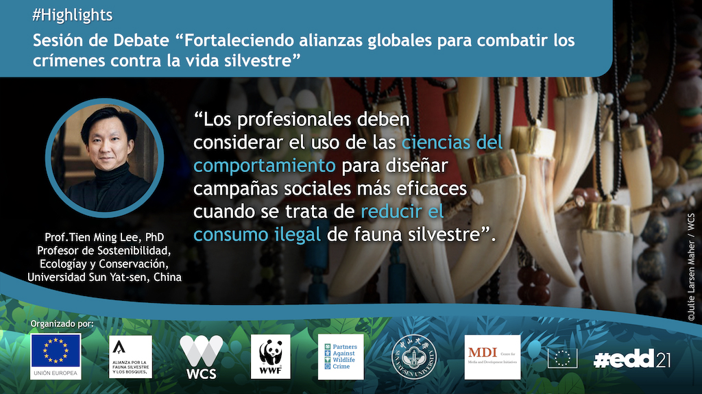 En el contexto de Asia, el profesor Tien Ming Lee de la Universidad Sun Yat-sen en China, aliado de la acción Partners Against Wildlife Crime, presentó los avances que realiza esta entidad académica en cuanto a la ciencia del comportamiento a través del diseño, prueba y evaluación de campañas orientadas a la reducción de la demanda ilegal de vida silvestre, siendo la primera vez que se desarrollan intervenciones considerando múltiples taxones y tipos de productos entre subpoblaciones en China. Luego de la implementación de estas campañas, se seleccionarán las más eficaces para posteriormente escalarlas a públicos más amplios. Sobre la base de este trabajo innovador, se planea desarrollar un conjunto de soluciones y enfoques útiles en la identificación de intervenciones factibles y eficaces para reducir la demanda de productos ilegales de la vida silvestre en este país.