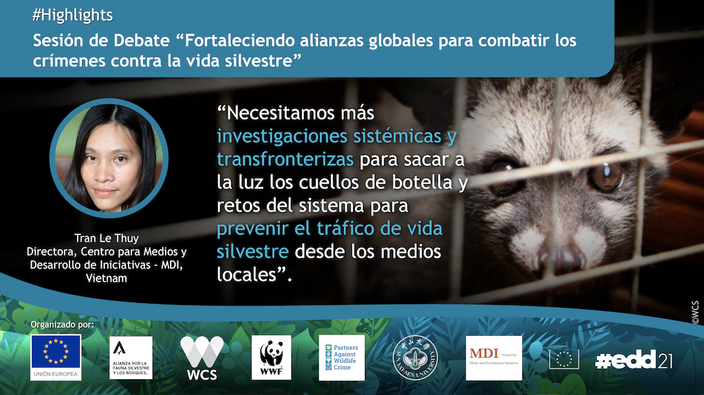 Asimismo, Thuy Tran Le, Directora del Centro de Medios de Comunicación e Iniciativas de Desarrollo – MDI), destacó varios casos de investigación sobre el tráfico de especies silvestres realizados por medios de comunicación en Vietnam. Sin embargo, señaló que existe una ausencia de investigaciones sistemáticas y transfronterizas, reflexionando sobre la necesidad e importancia de que los medios locales emprendan cada vez más trabajos periodísticos que permitan sacar a la luz el tráfico de especies silvestres, considerando también la realización de investigaciones transfronterizas para ofrecer un panorama más amplio de la problemática.