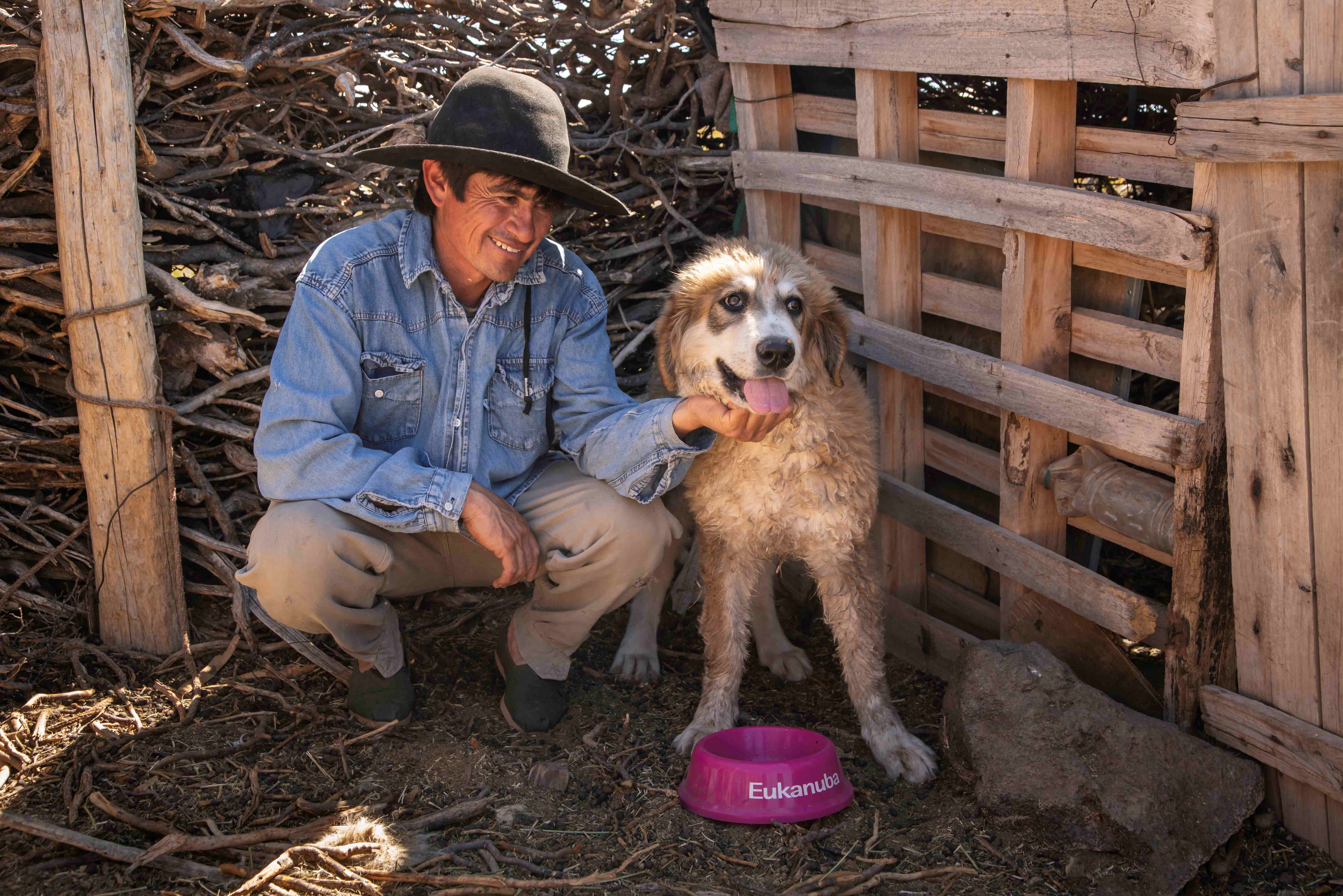 Productor Jacinto Moyano con su perro protector Auca en Neuquén. Crédito: Gregorio Ibáñez.